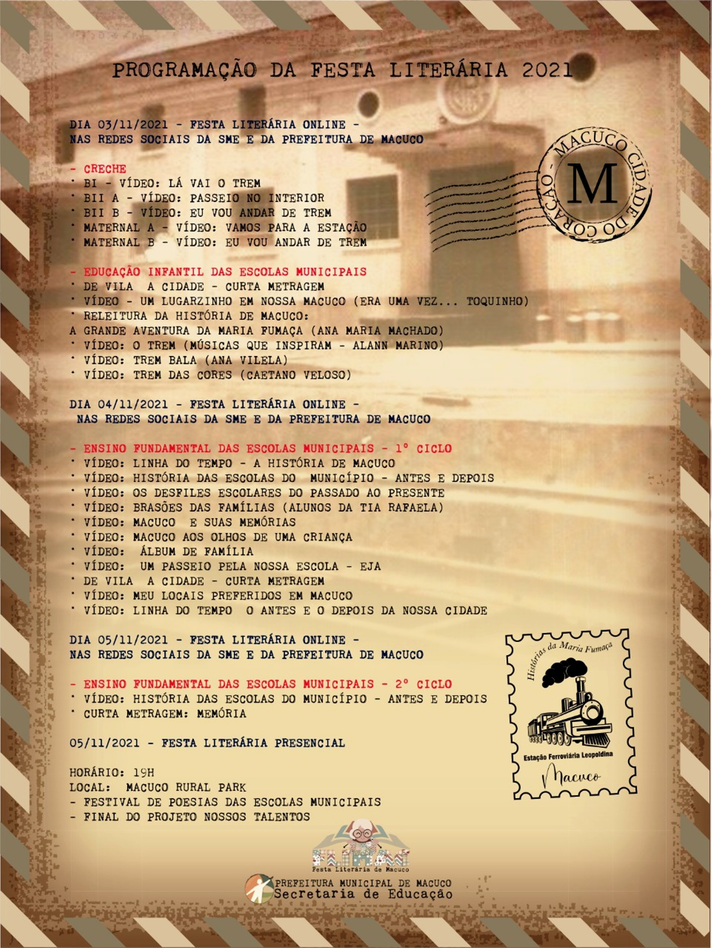 Convidando os moradores para uma ‘viagem imaginária no trem’ que percorrerá os trilhos da saudade com destino ao passado histórico do município, a Festa Literária de Macuco terá momentos virtuais e presenciais, com início nesta quarta-feira, 03, e encerramento no domingo, dia 07. “Vamos viajar juntos, contar para nossas crianças a história linda de nossa terra e nossa gente, que jamais deve ser esquecida. Venha nos visitar, traga sua família e suas memórias”, convida a secretária Luciana Boaretto.