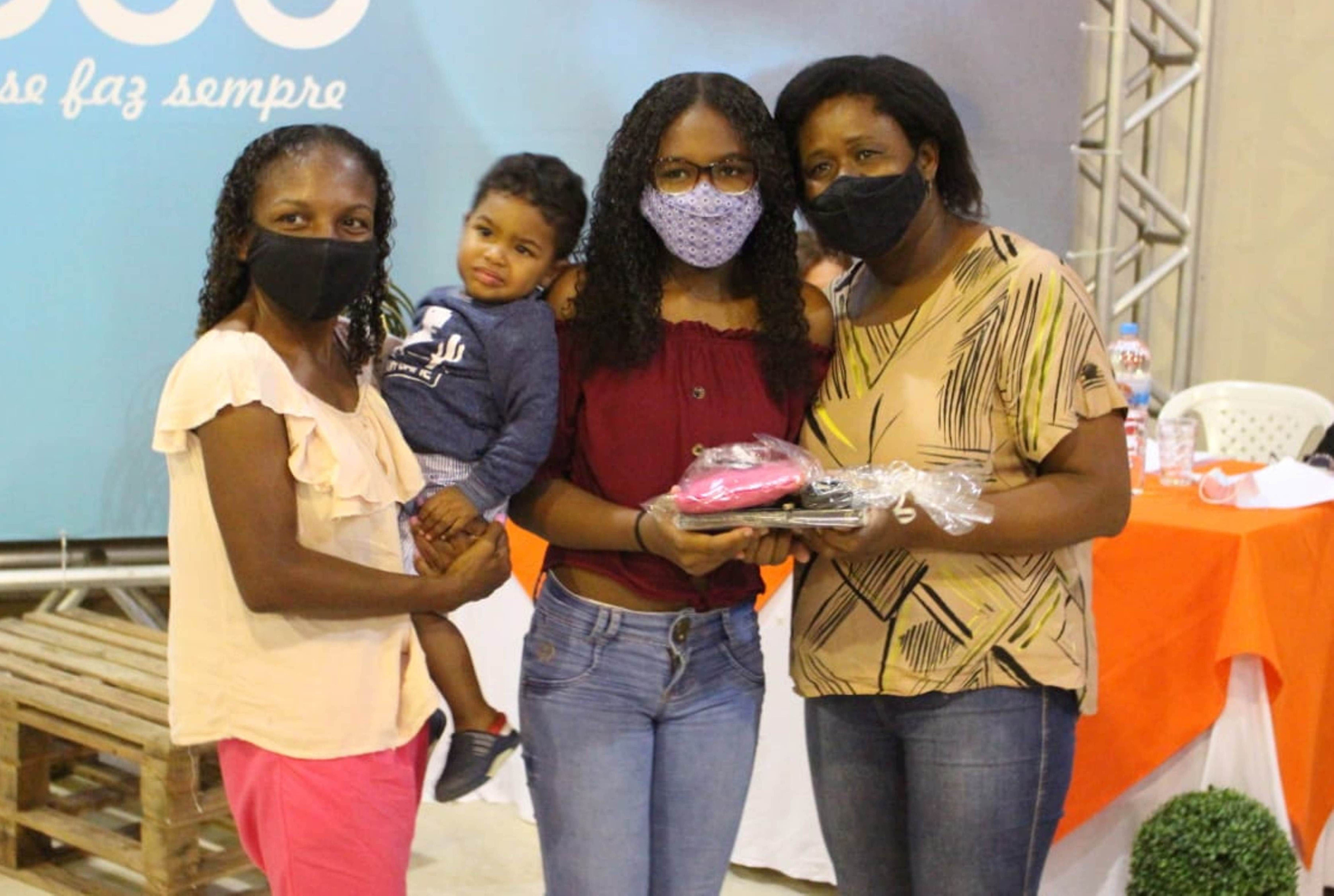 Victor Hugo, seus familiares e professora quando o menino recebeu a premiação das mãos da vice-prefeita Michelle Bianchini