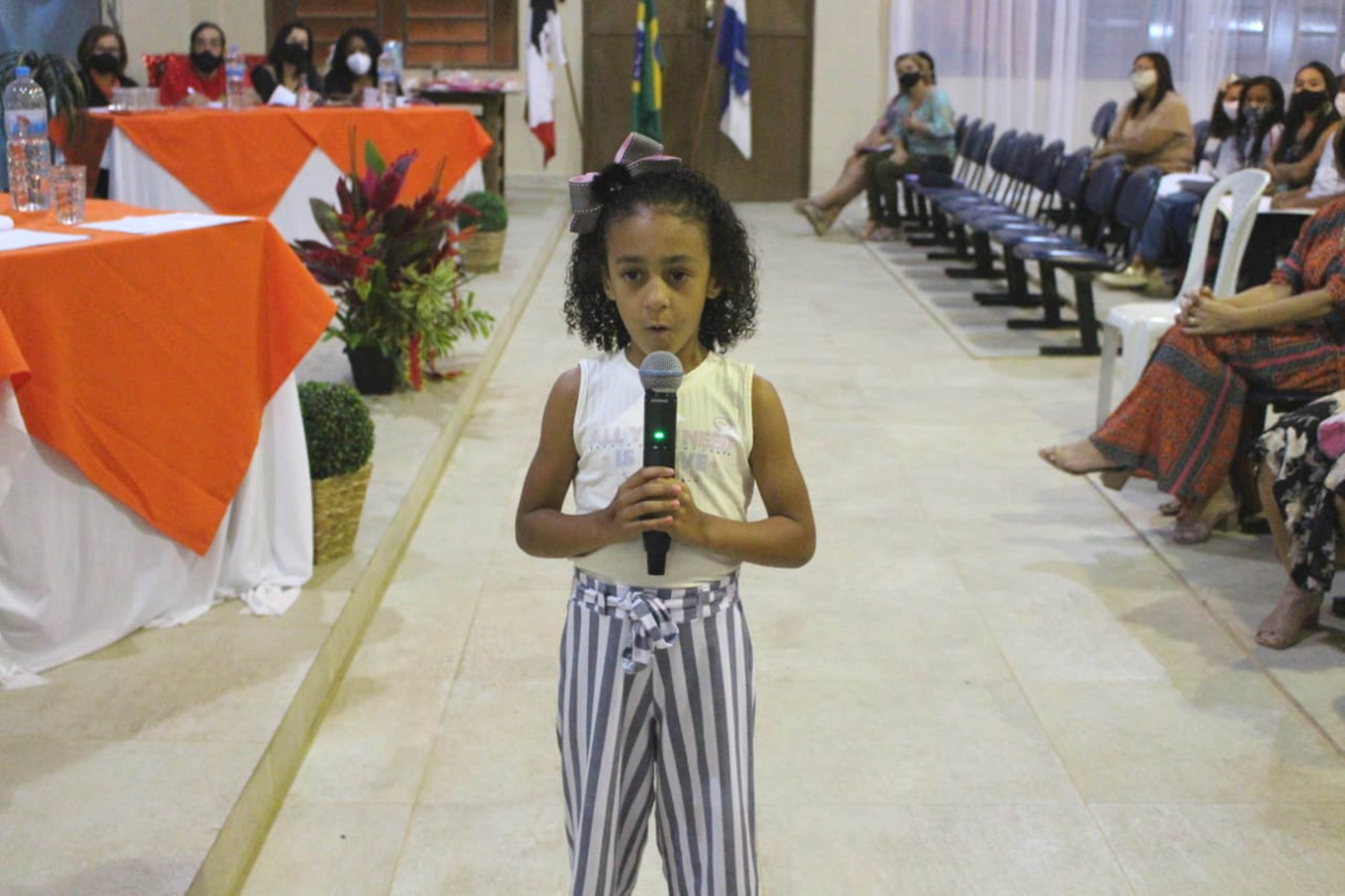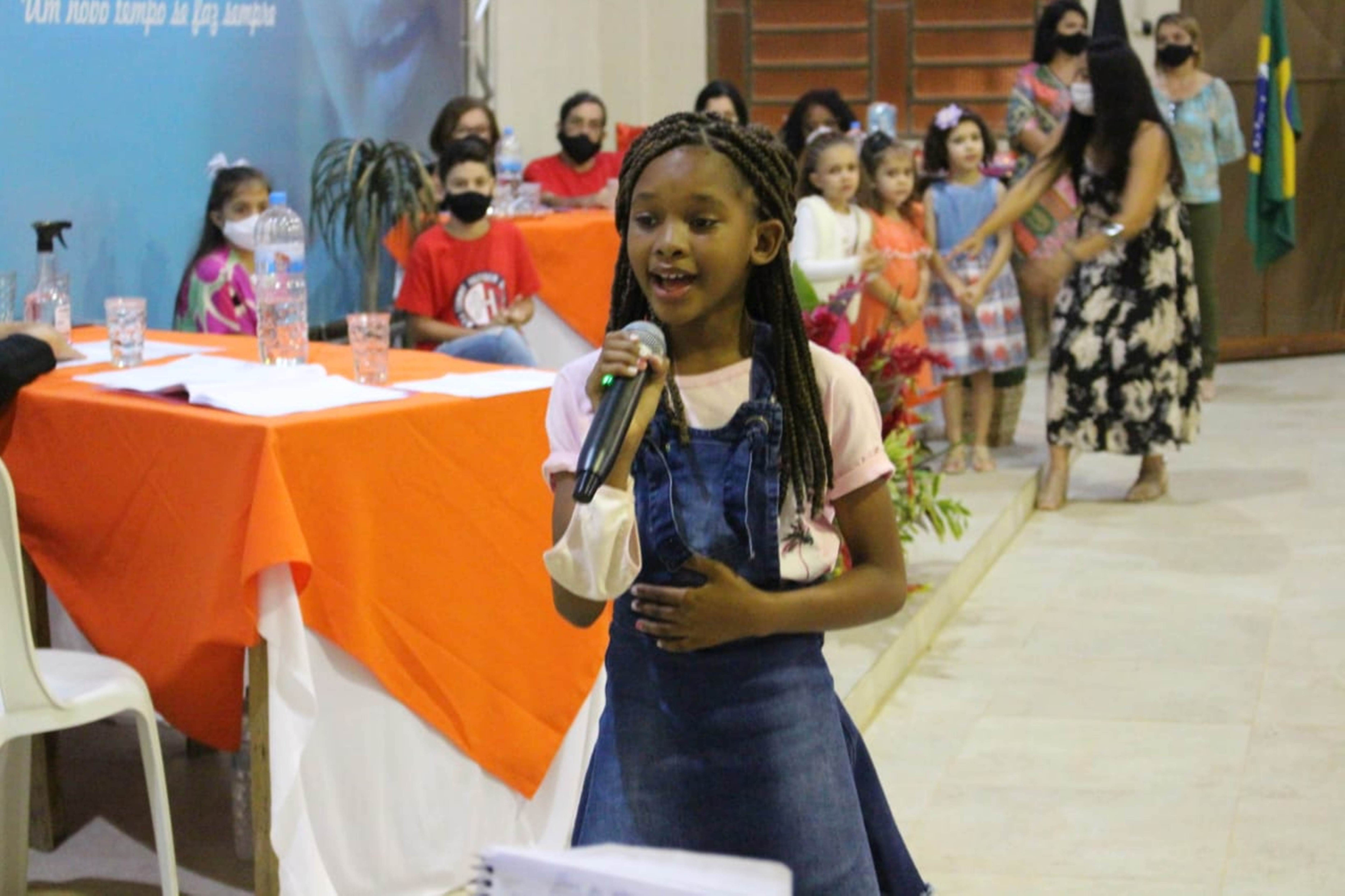 Mais uma pequena estudante que não se deixou intimidar pelo microfone e público e mostrou sua qualidade cantando o hino