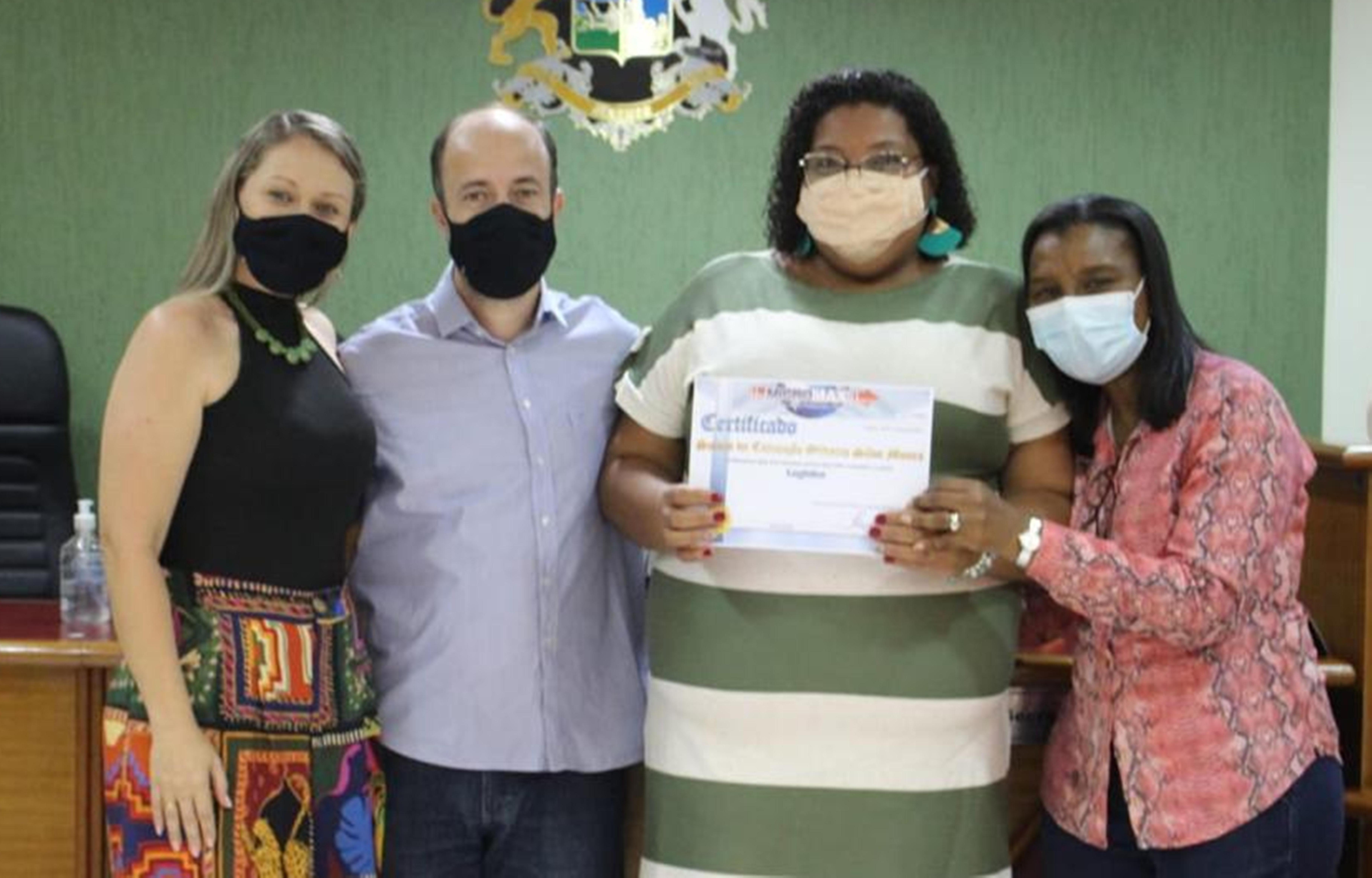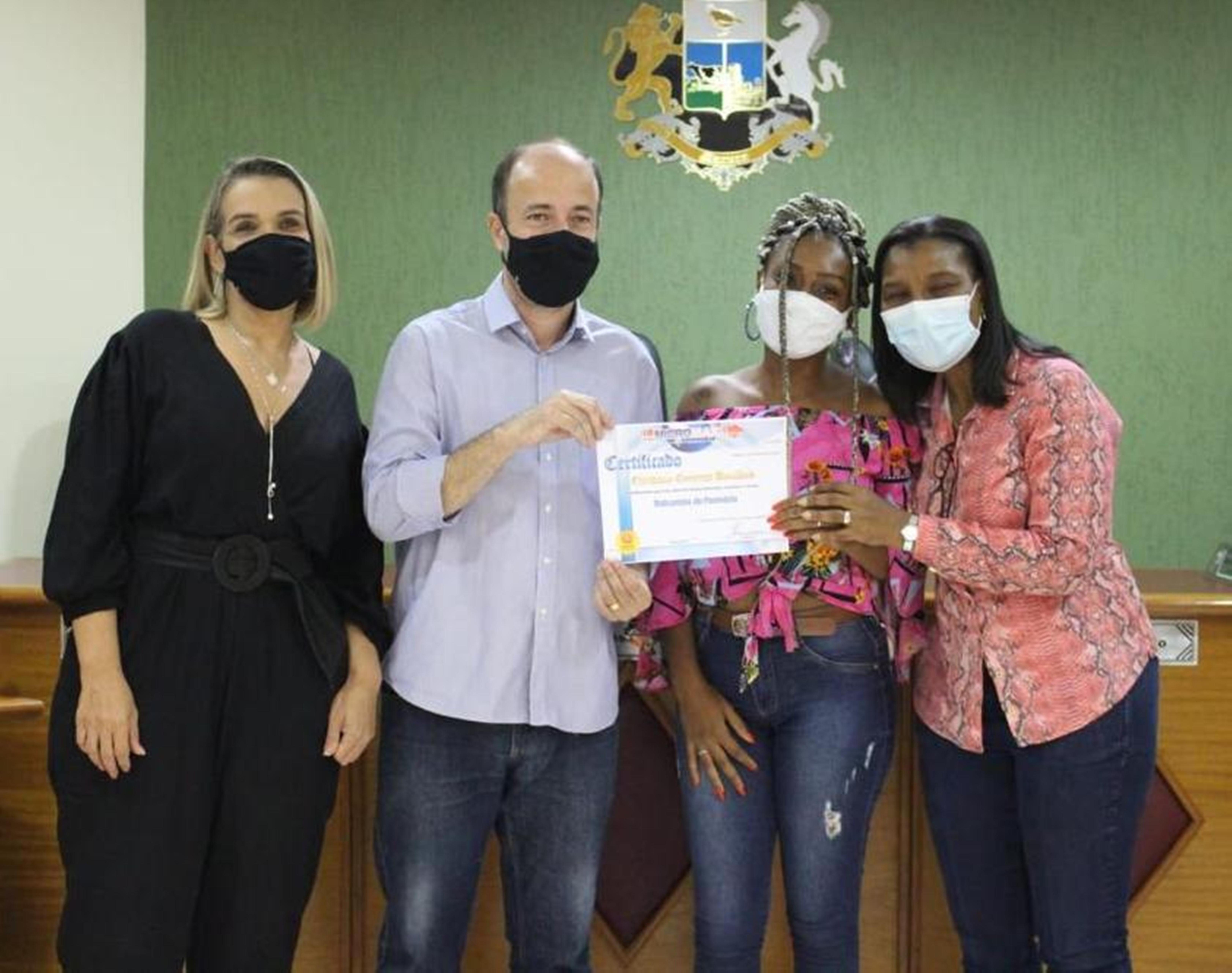 Cursista recebeu seu certificado e posou para a foto juntamente com o prefeito, a deputada federal e a primeira dama do município