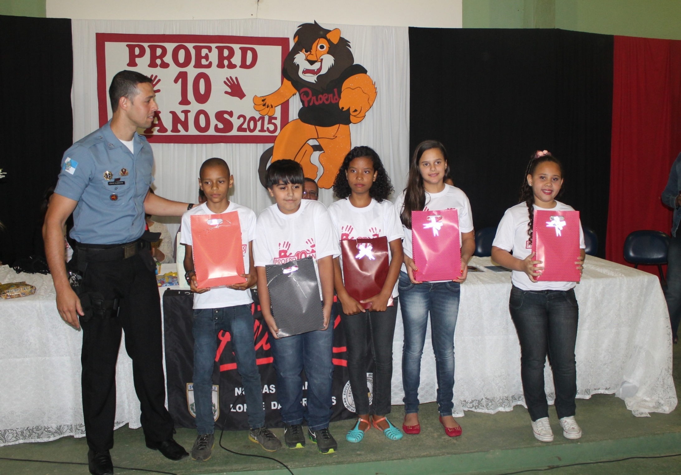 Para finalizar, foi realizada a apresentação da canção oficial do PROERD e um sorteio de brindes, que incluiu uma bicicleta doada por Félix e Marcelo. Por fim, os 99 alunos receberam seus certificados e posaram para as fotografias oficiais ao lado do PM Gualberto, que é muito querido pelos estudantes, diretores, professores e pais.