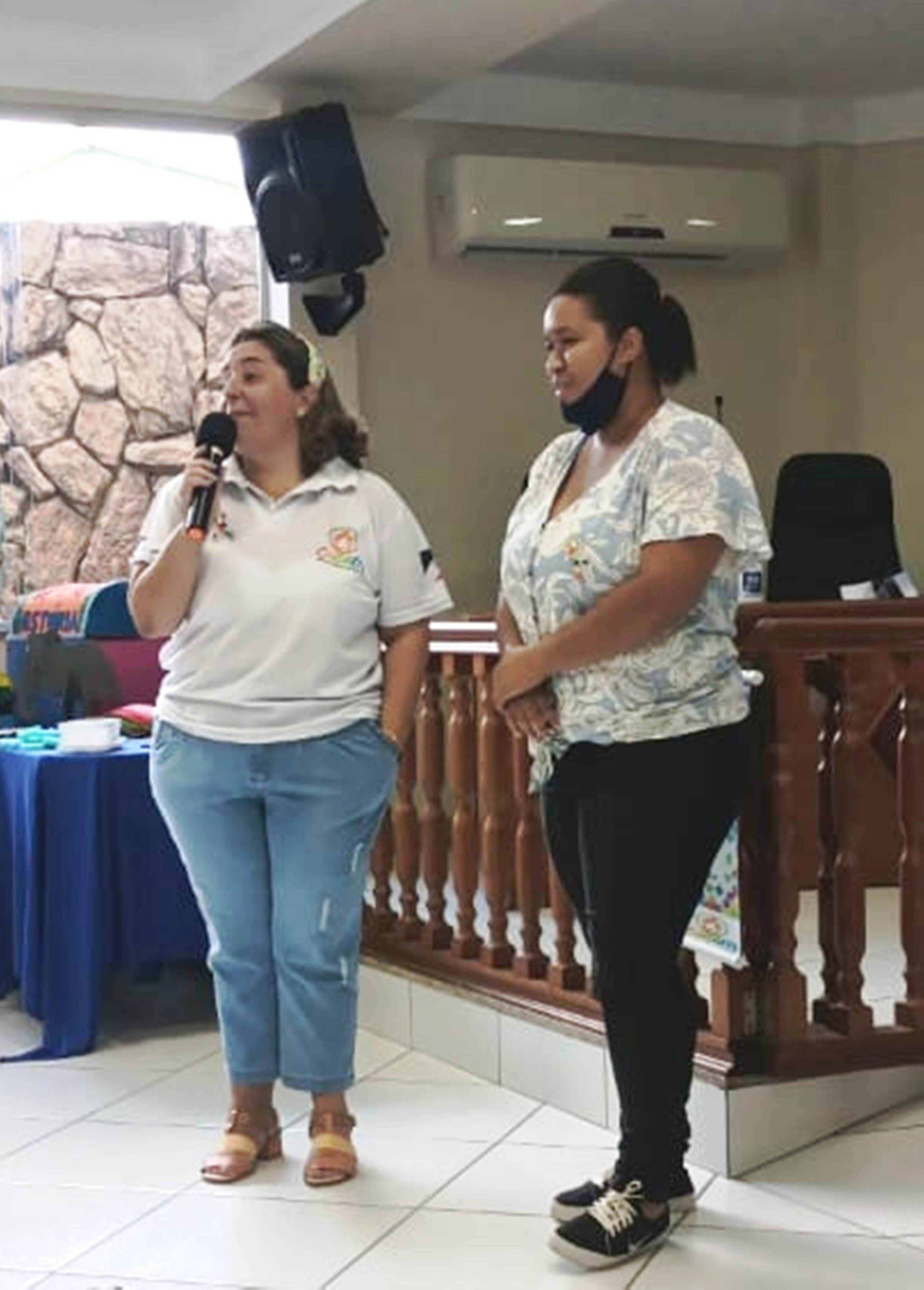 Integrantes da direção do CAEEM, a psicopedagoga Sheila Penavilla se dirige aos espectadores ao lado de Jeyne Tolentino