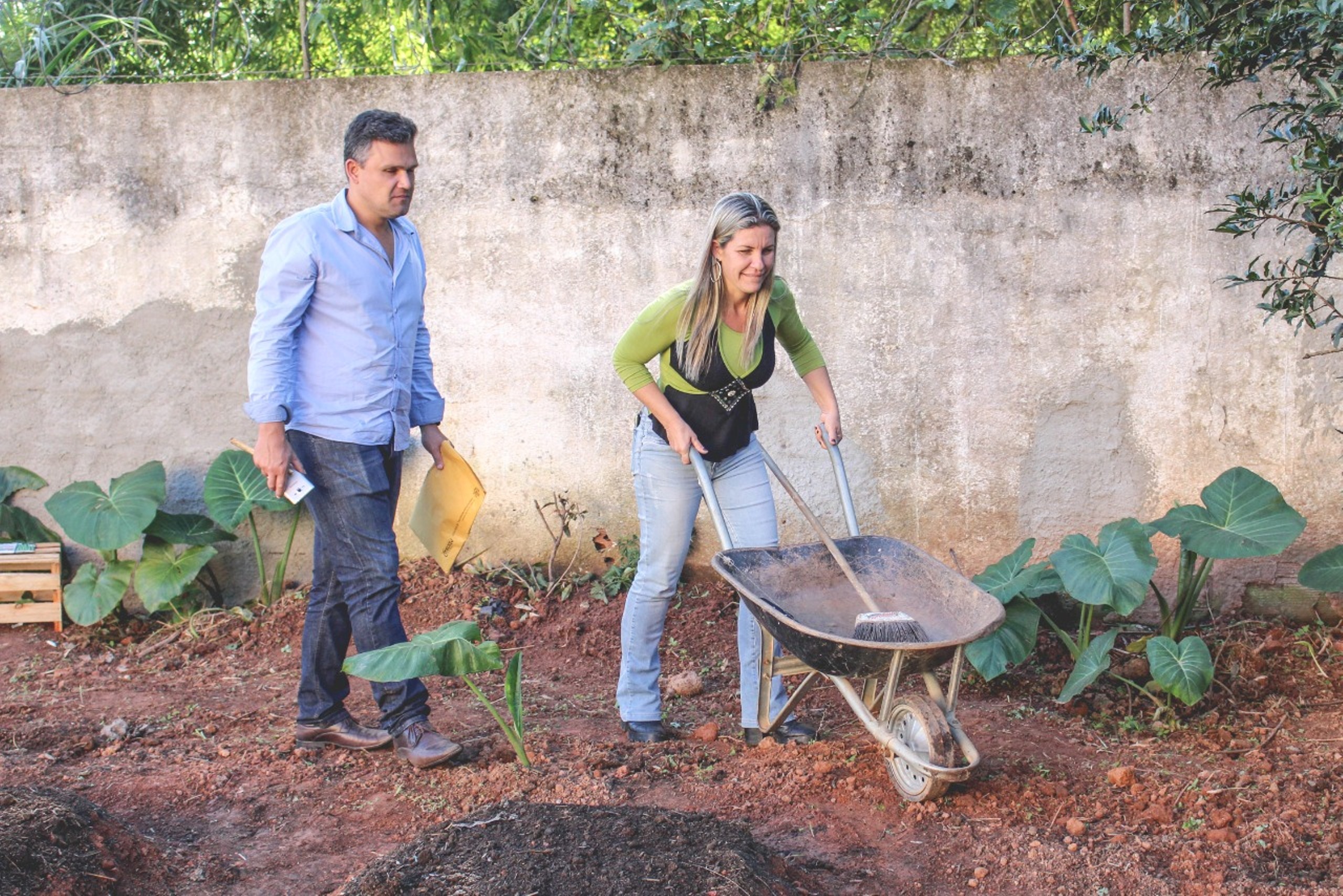 Entusiasta do projeto da Horta Escolar, o subsecretário de Governo e Gestão repassa explicações à prefeita Michelle Bianchini