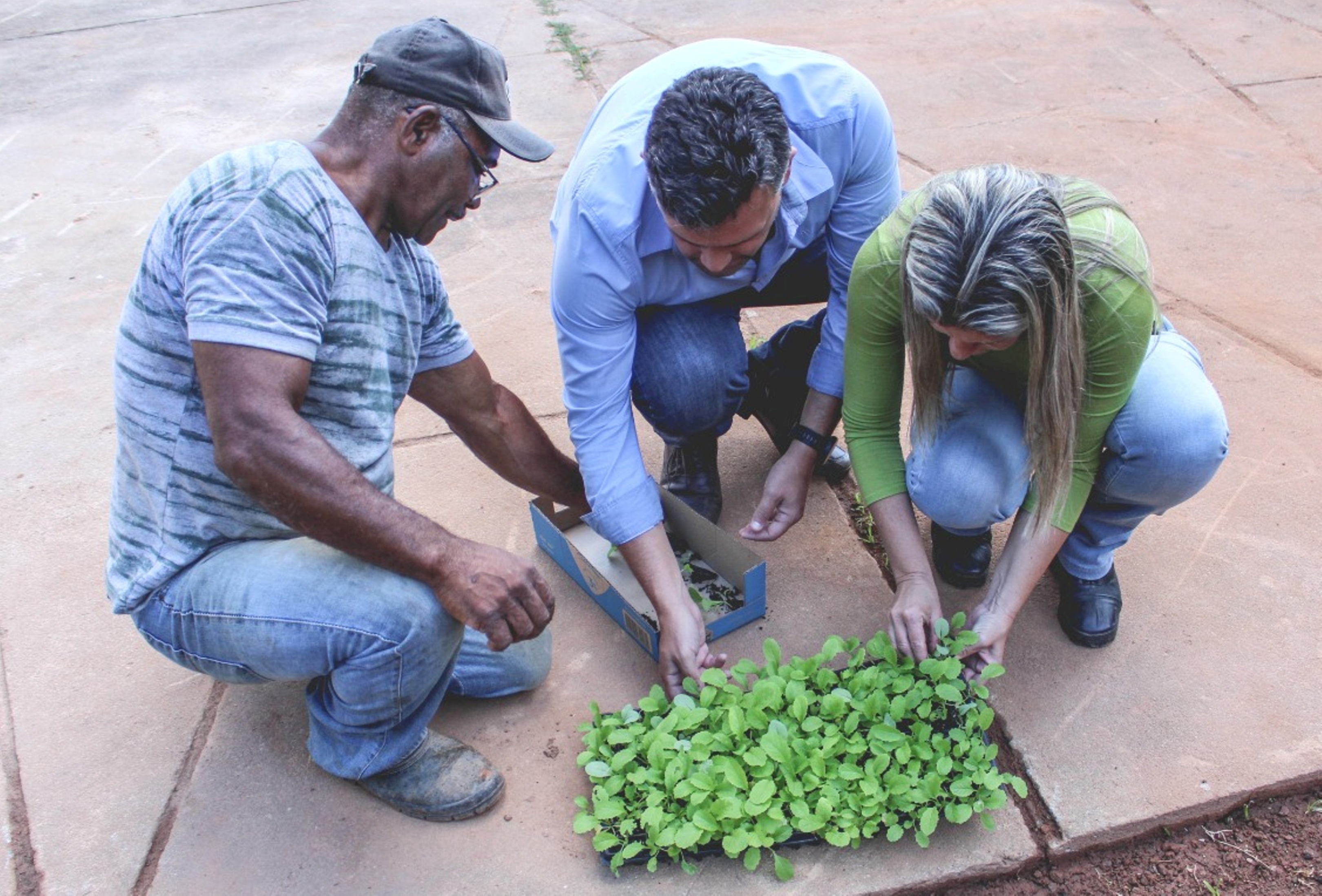 Com o auxílio de um dos servidores, a prefeita e o secretário de Governo selecionam as mudas para o plantio