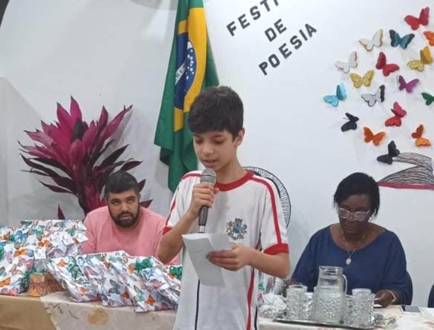 Com os jurados ao fundo, estudante do CIEP declama uma das poesias concorrentes no festival da escola