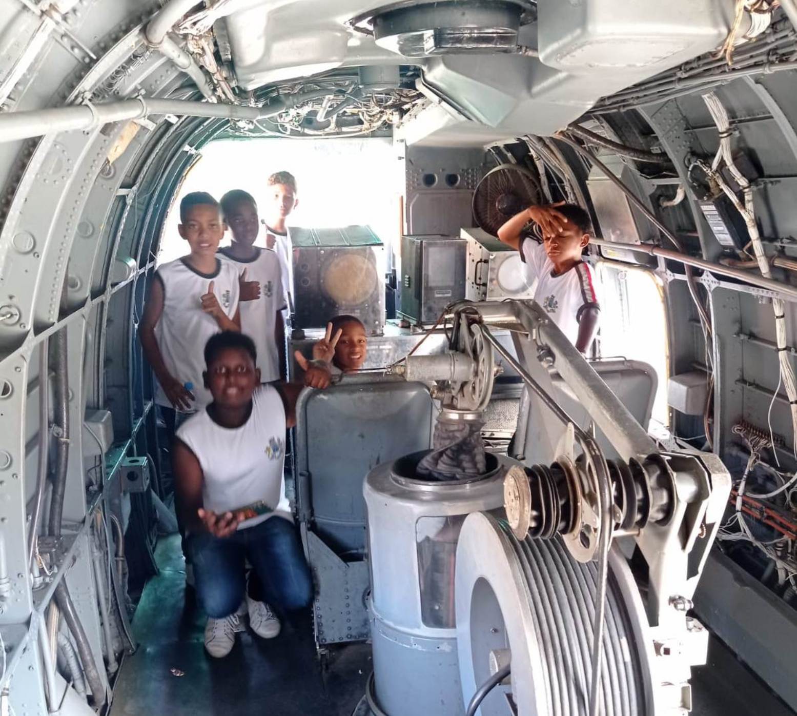Estudantes se sentindo verdadeiros tripulantes de uma das embarcações da Marinha do Brasil durante o passeio