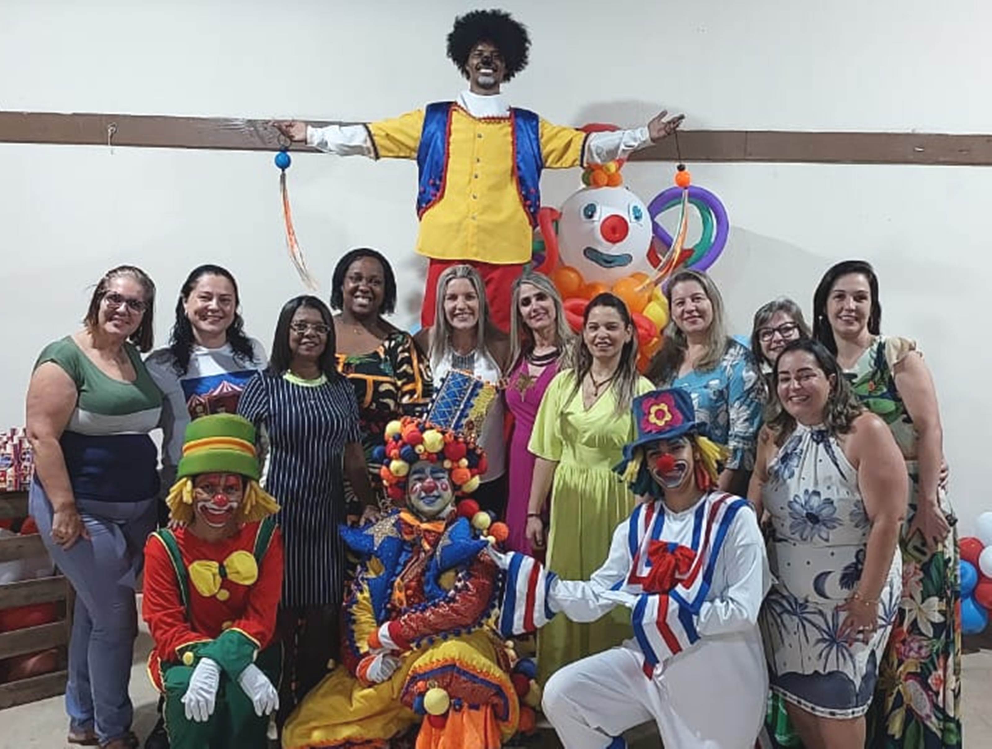 Prefeita Michelle Bianchini, professoras Marcelle Golinelli e Rosiane Miranda vestidas à caráter e os palhaços Gepeto e Viola