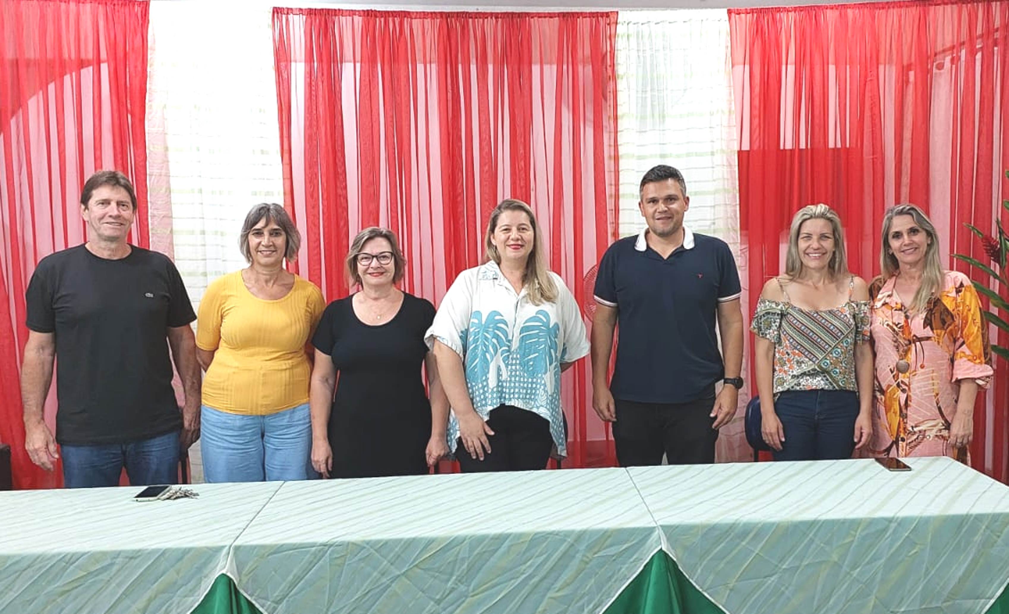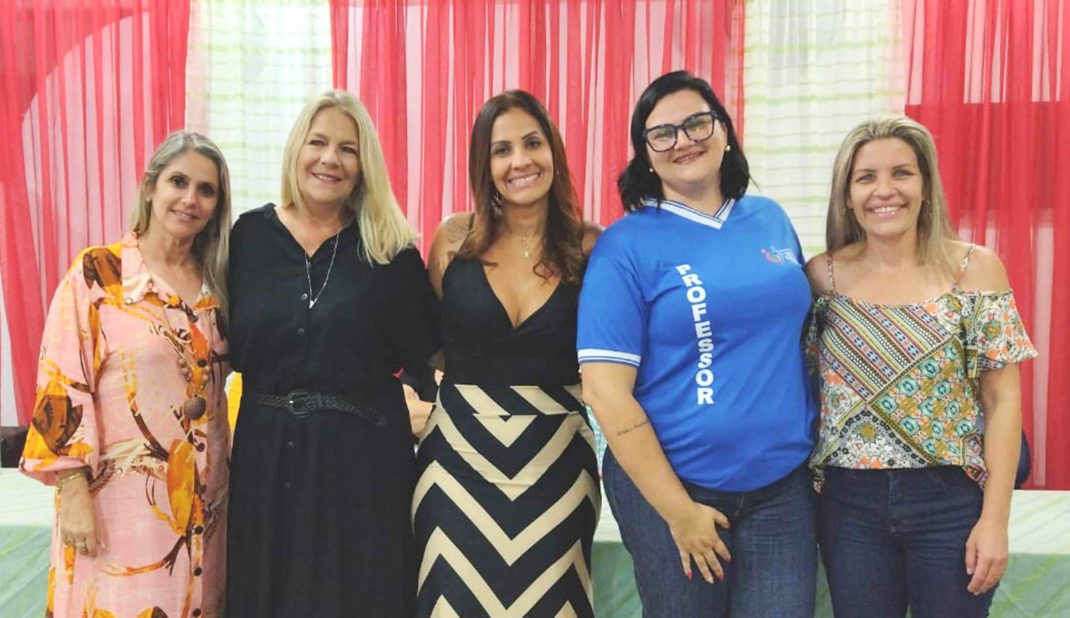 Professoras Rosane Valéria Caldas, Andiara Meirelles e Marina Espíndola entre a secretária de Educação Claudia Vogas e a prefeita Michelle Bianchini