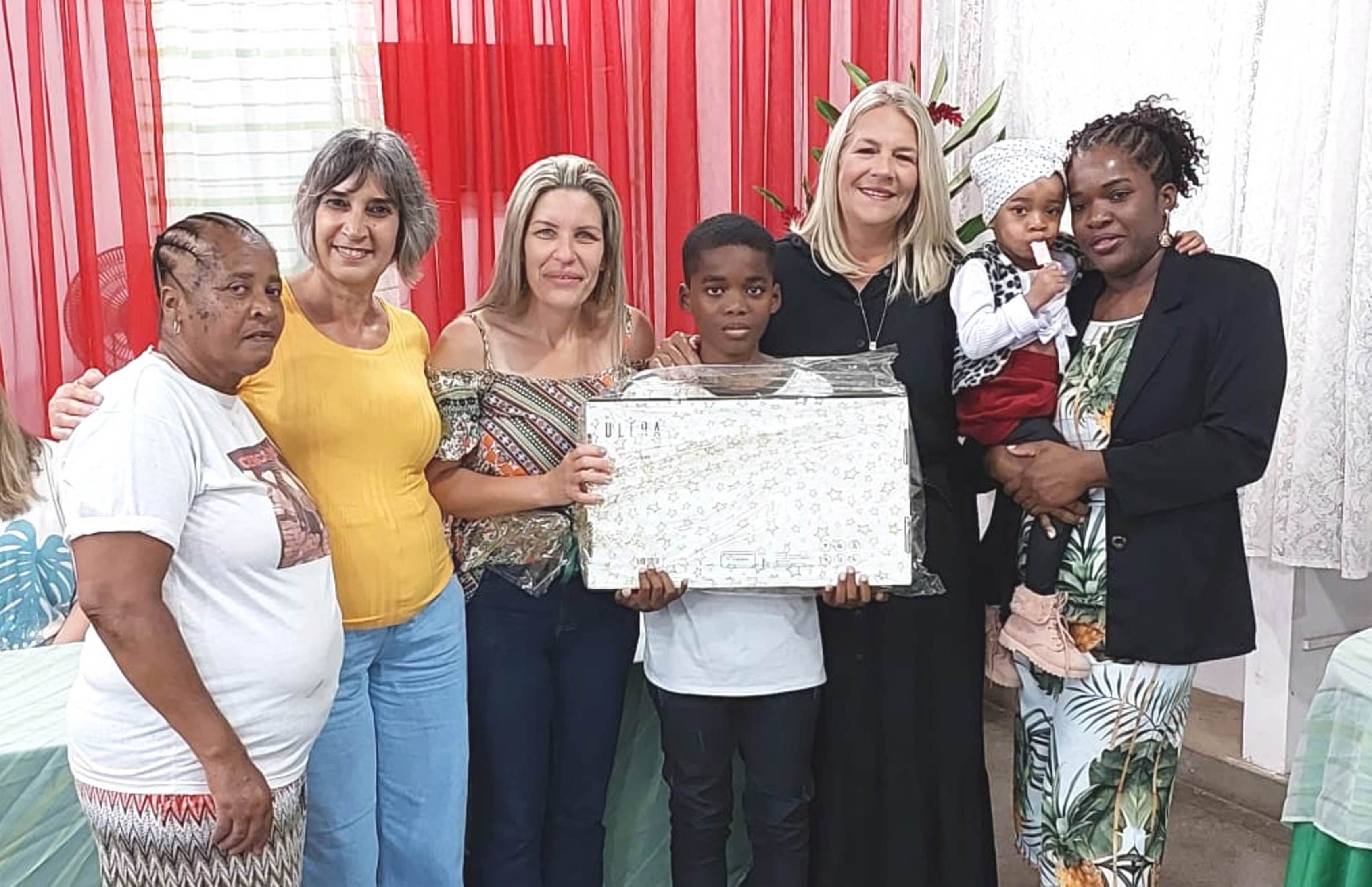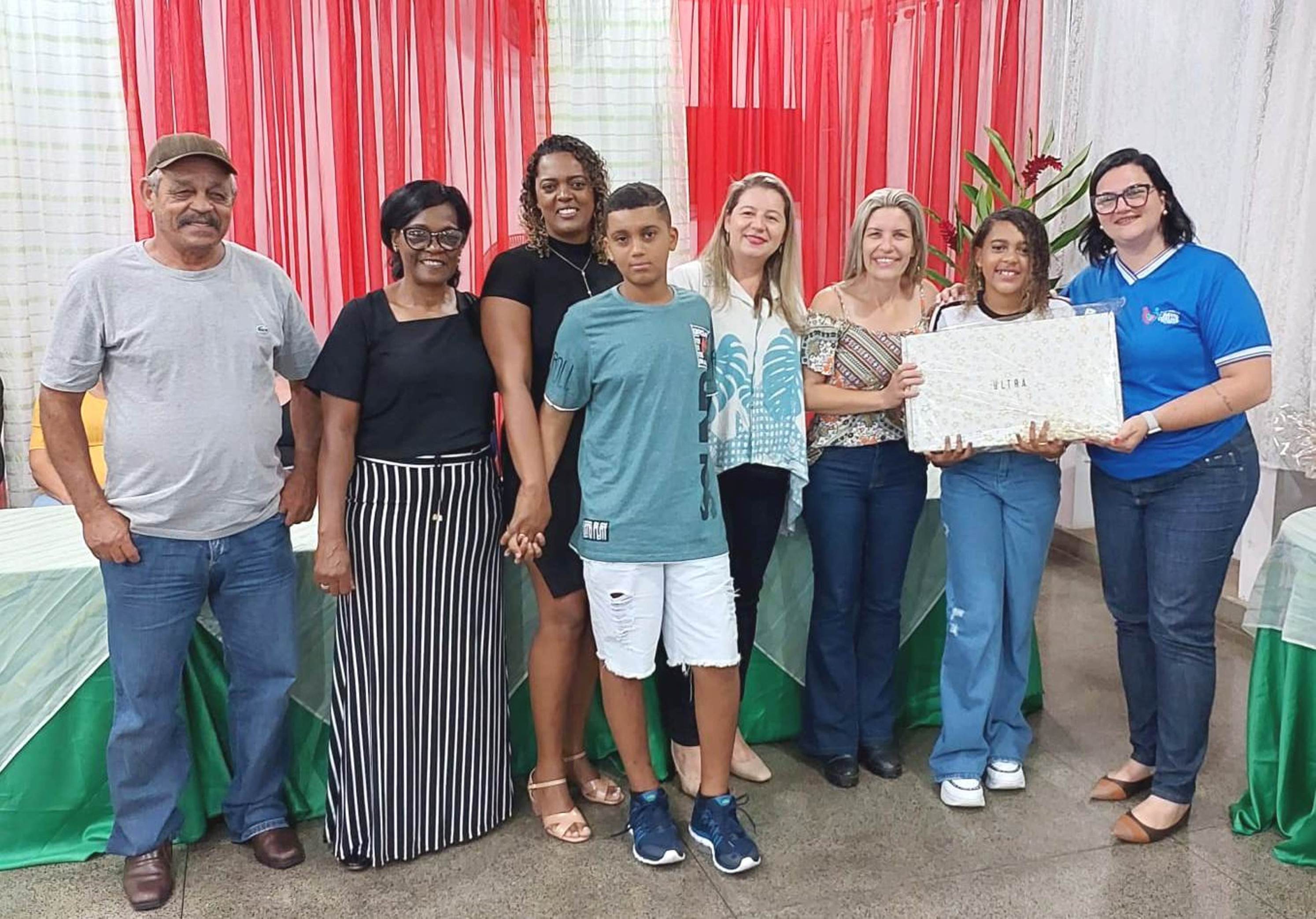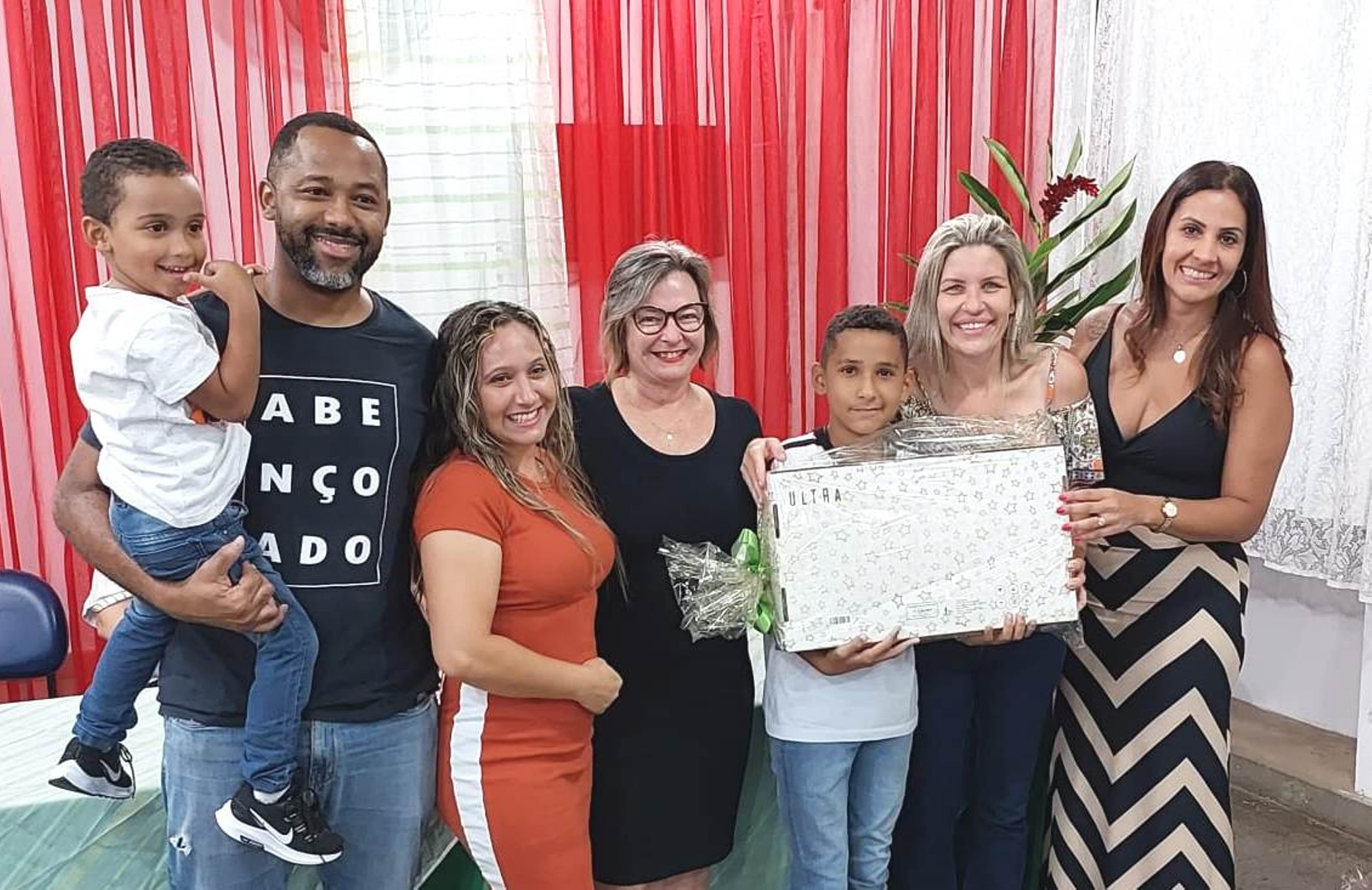 Outra família feliz com o vencedor do notebook, repassado pela prefeita Michelle Bianchini, professora e diretora da Escola Sylvia Bath Rosas