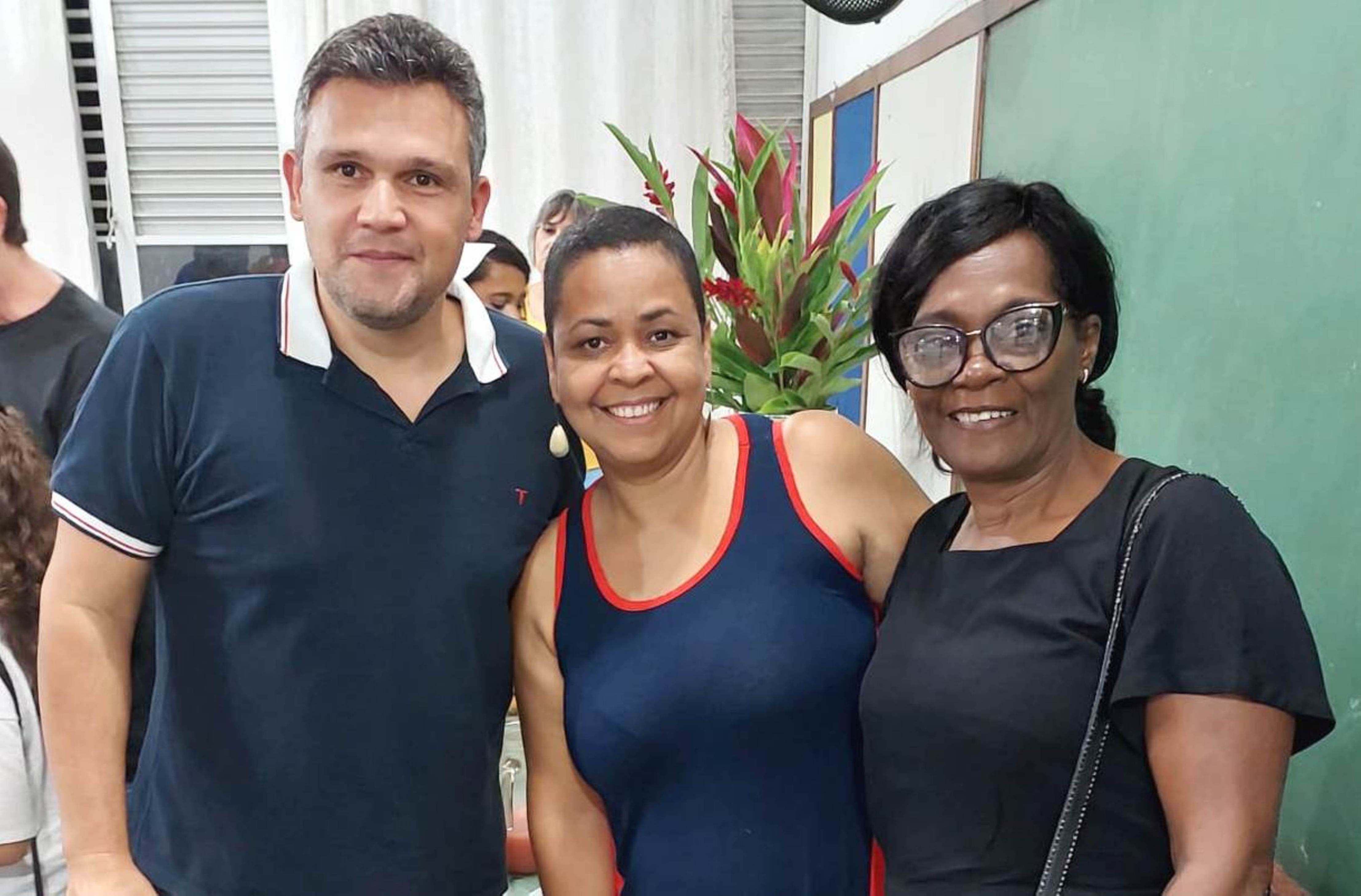 Prefeita Michelle Bianchini, diretora e professora do CIEP Honório Peçanha durante a entrega de um dos prêmios