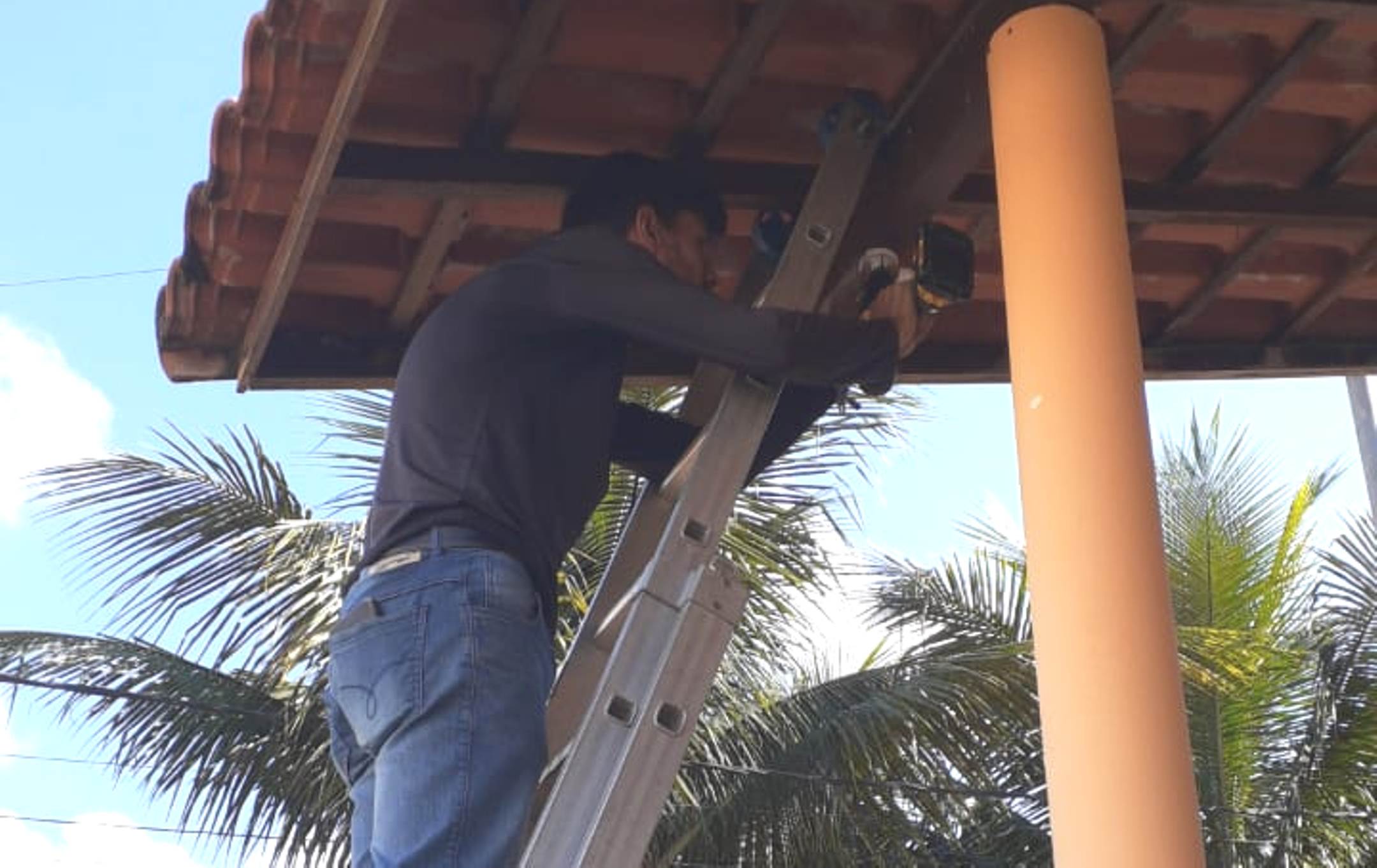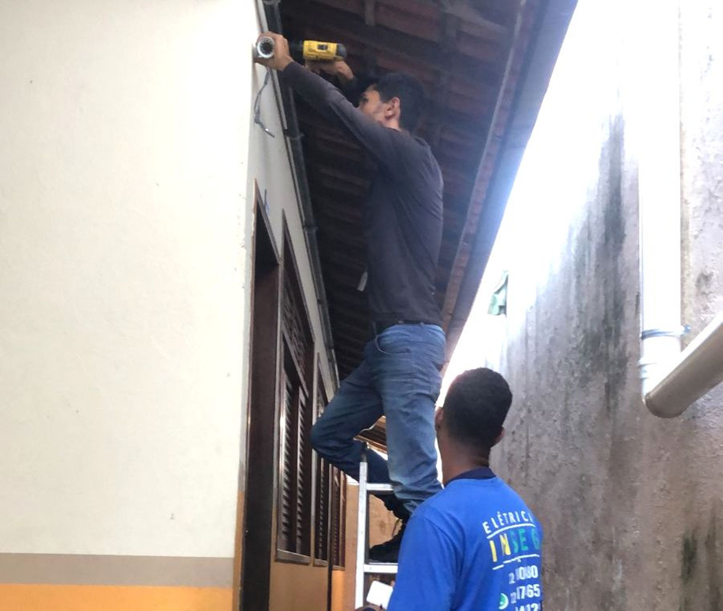 Técnico trabalhando na instalação do sistema de segurança na Escola Sylvia Bath Rosas, no bairro Volta do Umbigo
