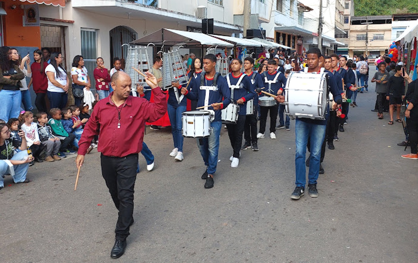 Figura conhecida do mundo musical, o maestro Isaac Gomes conduz ao ritmistas da Banda Marcial do Colégio Estadual Rodolpho Albino