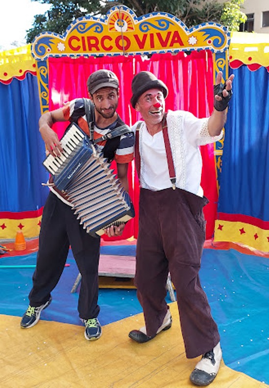 Momento marcante da tarde desta sexta-feira, Palhaço Pirilampo e seu músico dando um show no Circo Viva