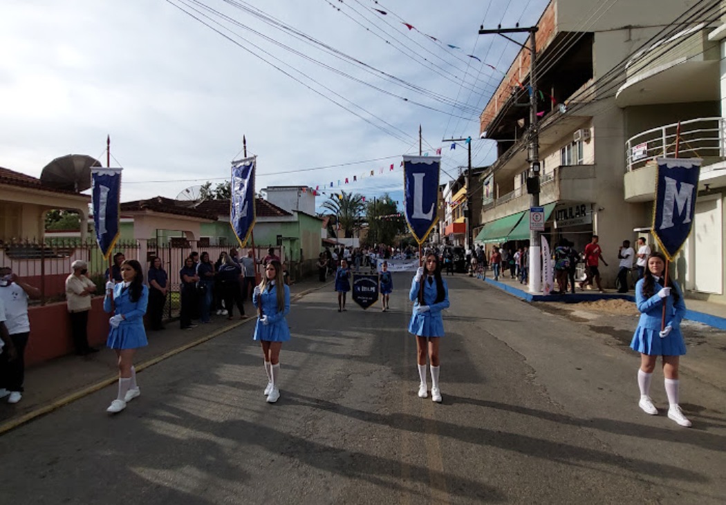 Jovens alunas conduzem os estandartes formando as iniciais do Instituto Educacional Laura Montechiari