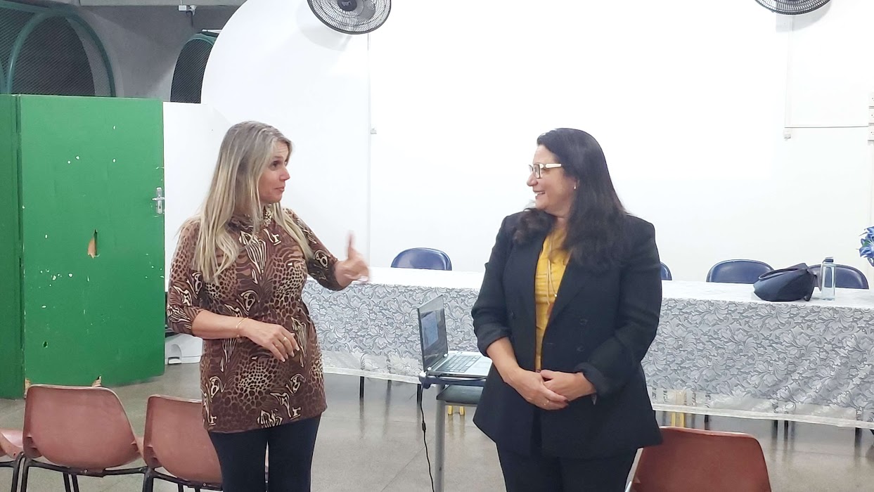 Fonoaudióloga Claudia Mourão interagindo com a secretária de Educação Claudia Vogas durante uma das dinâmicas de grupo