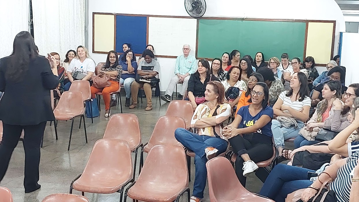 Profissionais da Rede Municipal de Ensino recebendo o aprendizado ofertado pela palestrante graças à parceria com o SEBRAE