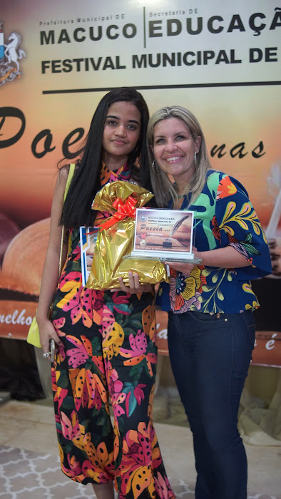 Uma das vencedoras ao lado da professora Claudia Vogas, secretária de Educação que ao lado de sua equipe pedagógica organizou o festival