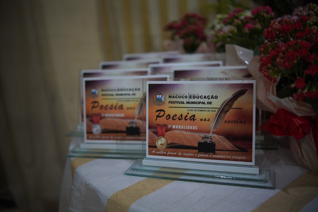 Os troféus das duas categorias em disputa na Fase Final do Festival Municipal de Poesia nas Escolas de Macuco foram entregues aos vencedores