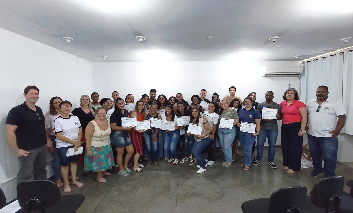 Foto oficial feita com as autoridades municipais, a palestrante e os participantes, que receberam seus certificados após o curso