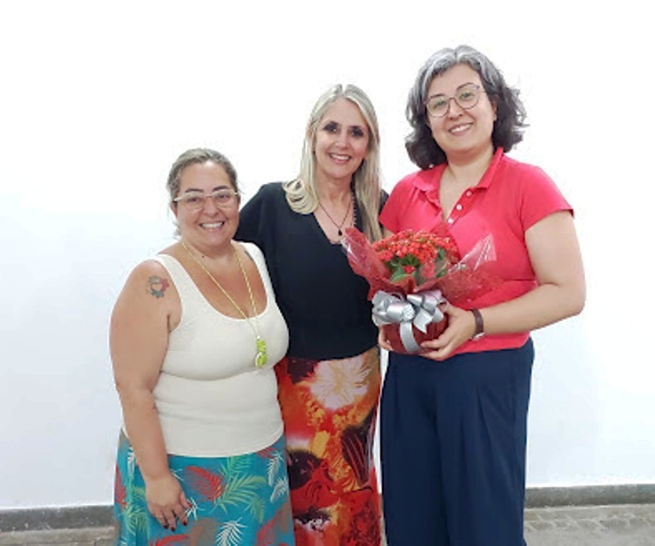 Sheila Penavilla e Claudia Vogas entregaram um vaso de flor como forma de agradecimento à palestrante Kamila Grativol