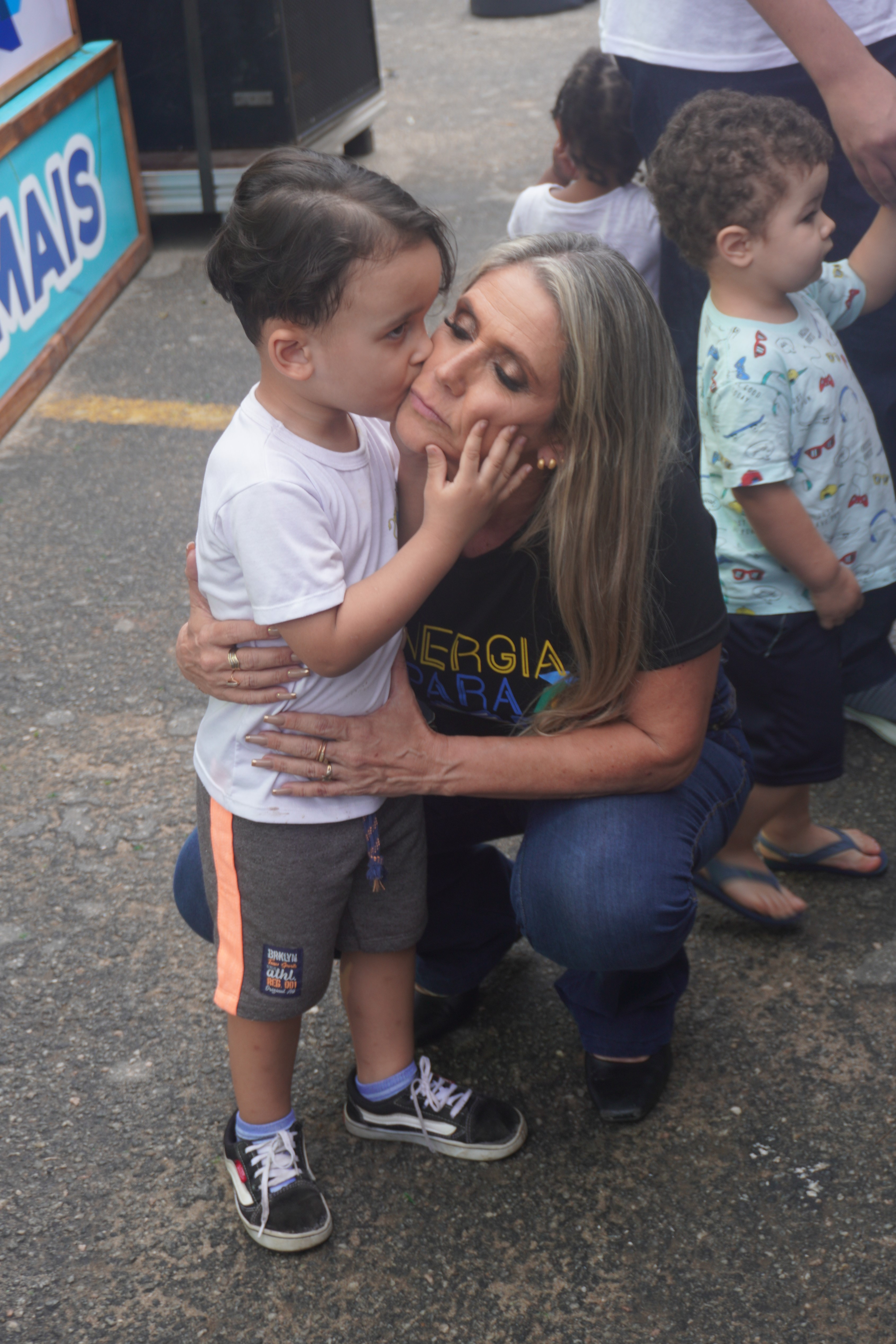 Habituada ao cotidiano escolar, a secretária de Educação Claudia Vogas acolheu com afeto um dos aluninhos presentes