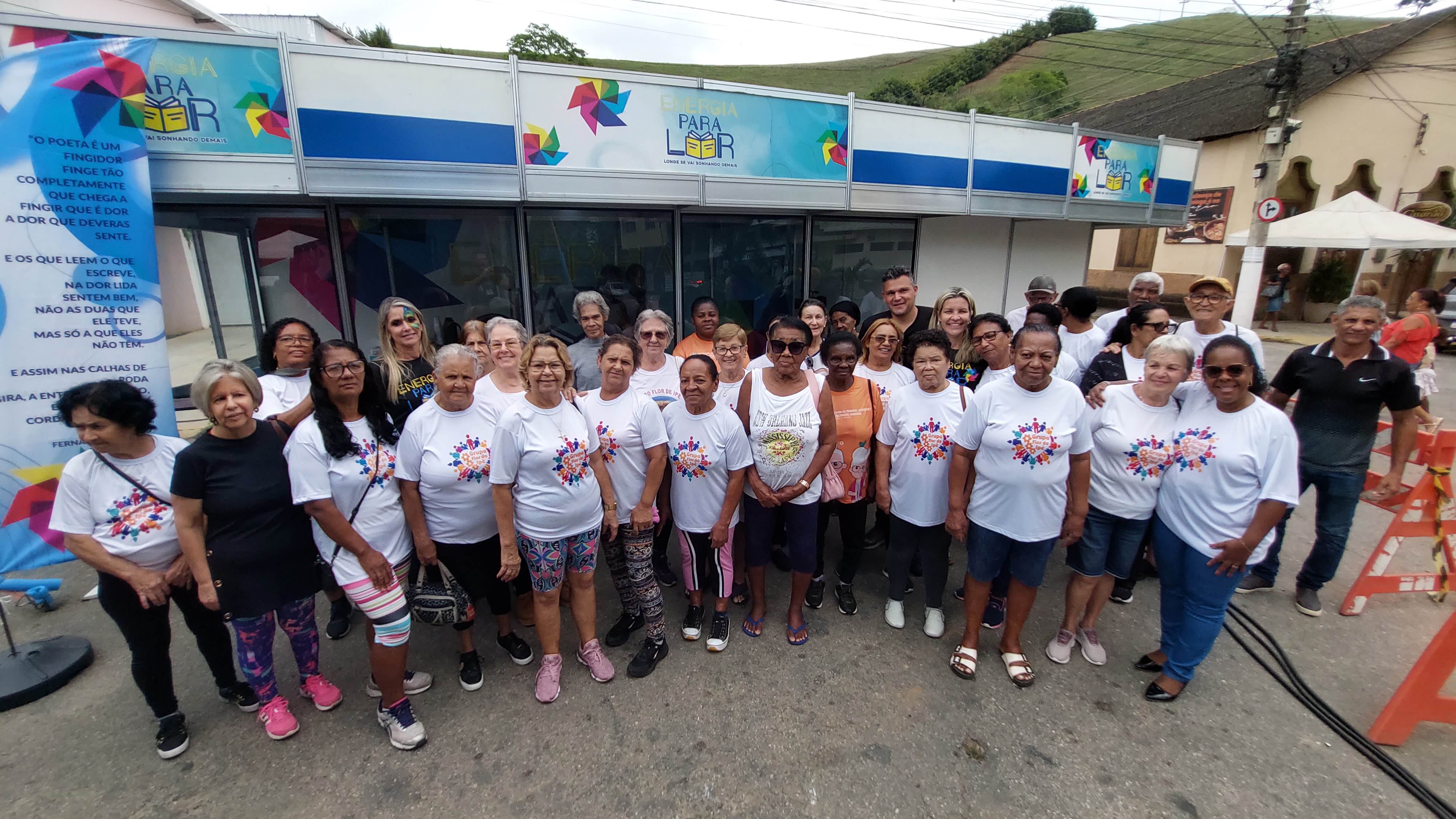 Michelle Bianchini, João Vitor Pontes, Claudia Vogas e Margareth Anselmo ao lado dos integrantes da ‘melhor idade’ de Macuco