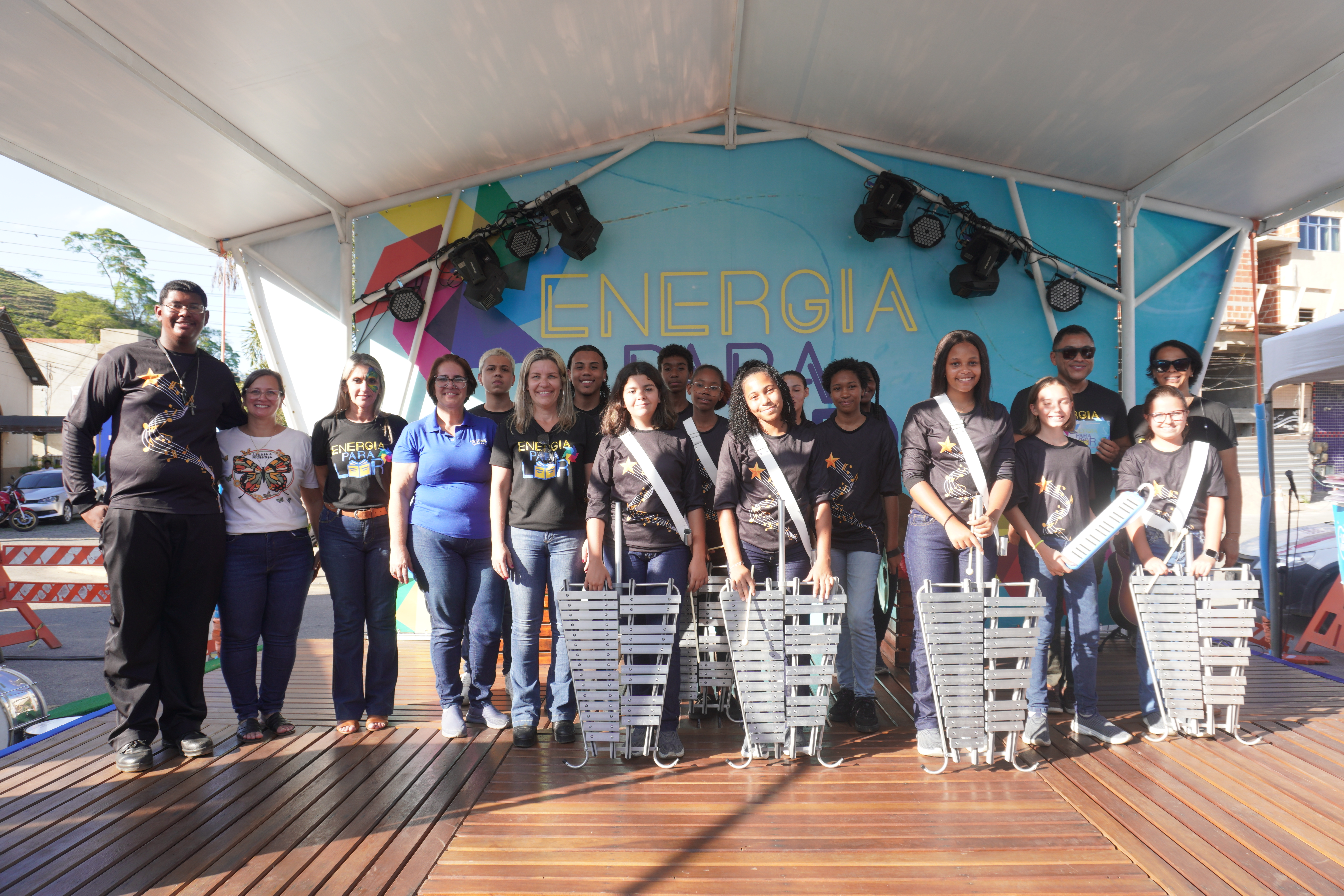 Imagem bacana dos estudantes macuquenses diante do letreiro alusivo ao projeto ‘Energia Para Ler’ em Macuco