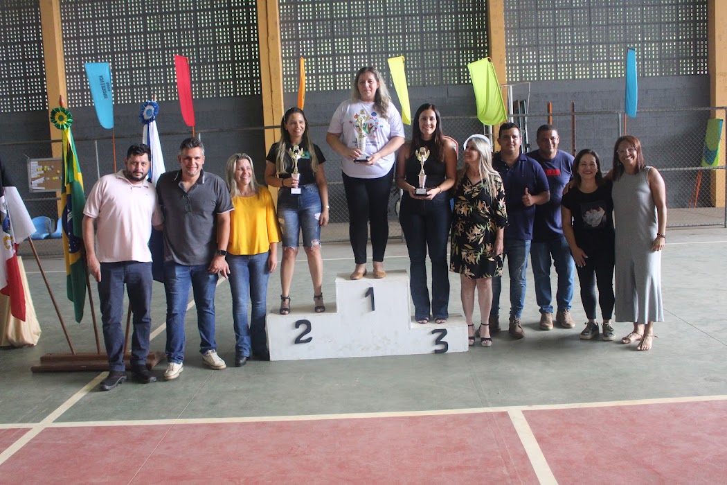 Autoridades municipais ao lado dos representantes das escolas do município durante a premiação do evento no pódio oficial
