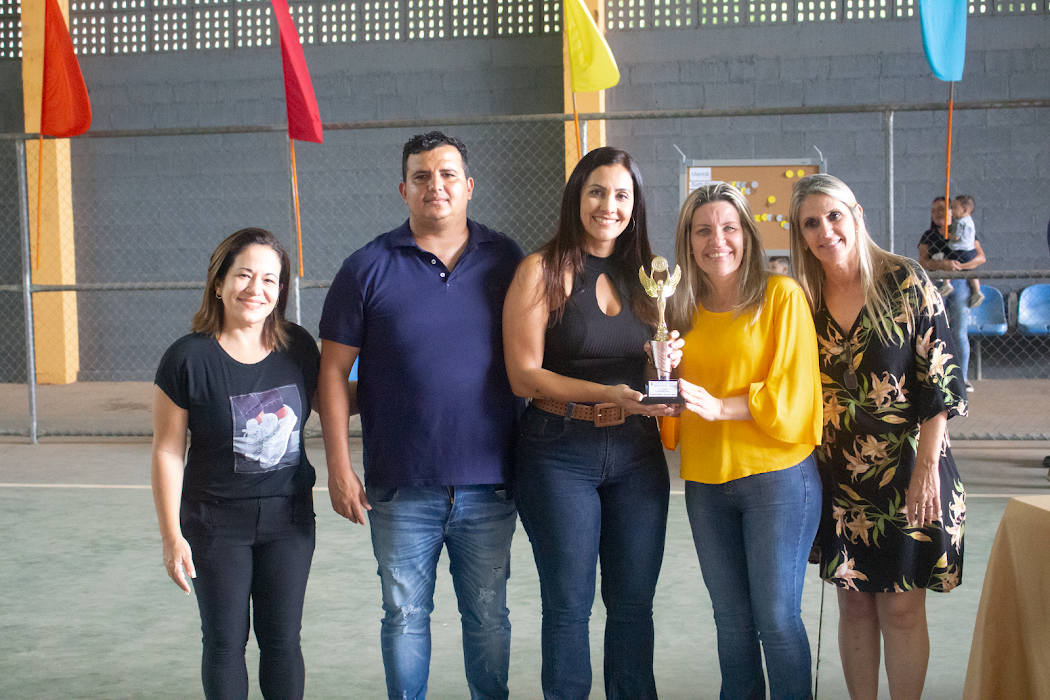 Prefeita de Macuco, juntamente com o secretário de Esporte e Lazer e sua subsecretária, além da secretária de Educação, entregando o troféu a Escola Bath Rosas