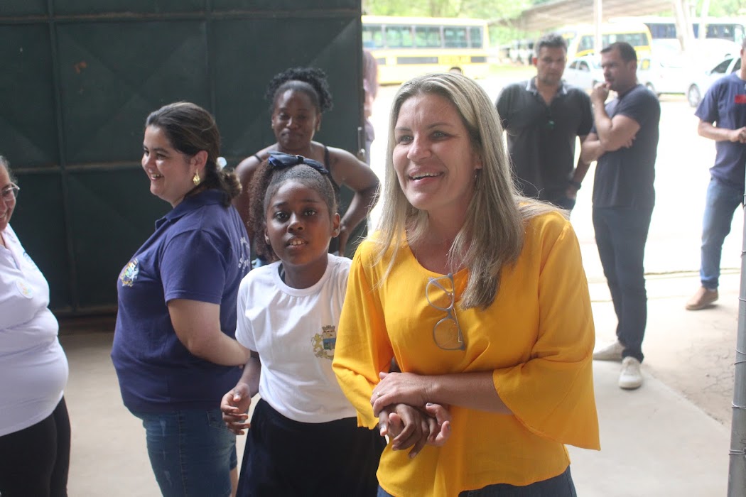 A alegria no sorriso da prefeita Michele Bianchini com uma das alunas que participaram do evento de encerramento das Olimpíadas Estudantis de Macuco