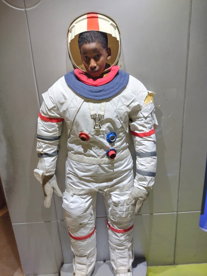 Durante as visitações, o jovem estudante macuquense experimentou a oportunidade de se tornar um astronauta pelo menos para o registro fotográfico