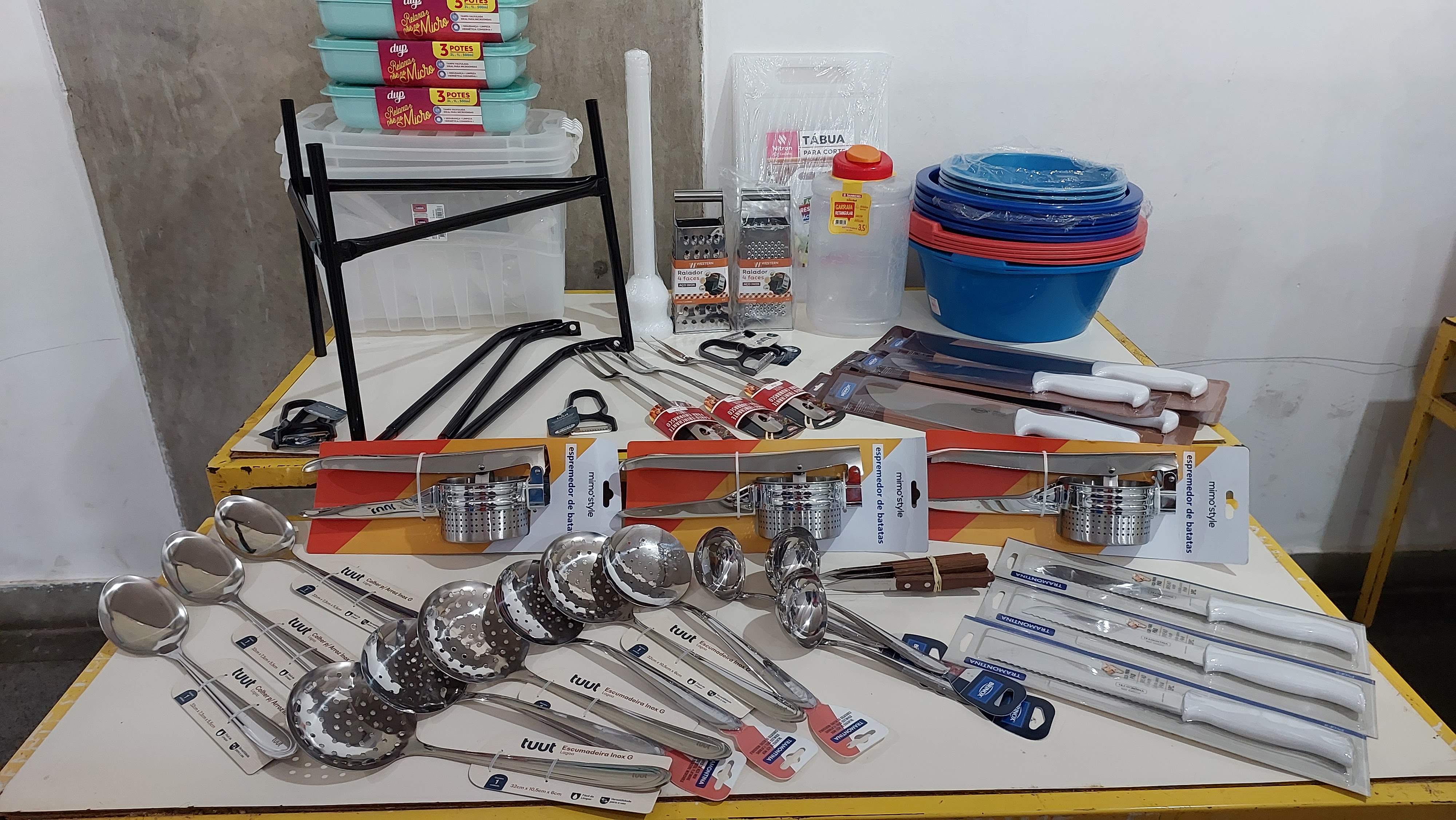 Utensílios como escumadeiras, conchas, facas, entre outros são expostos em cima da mesa