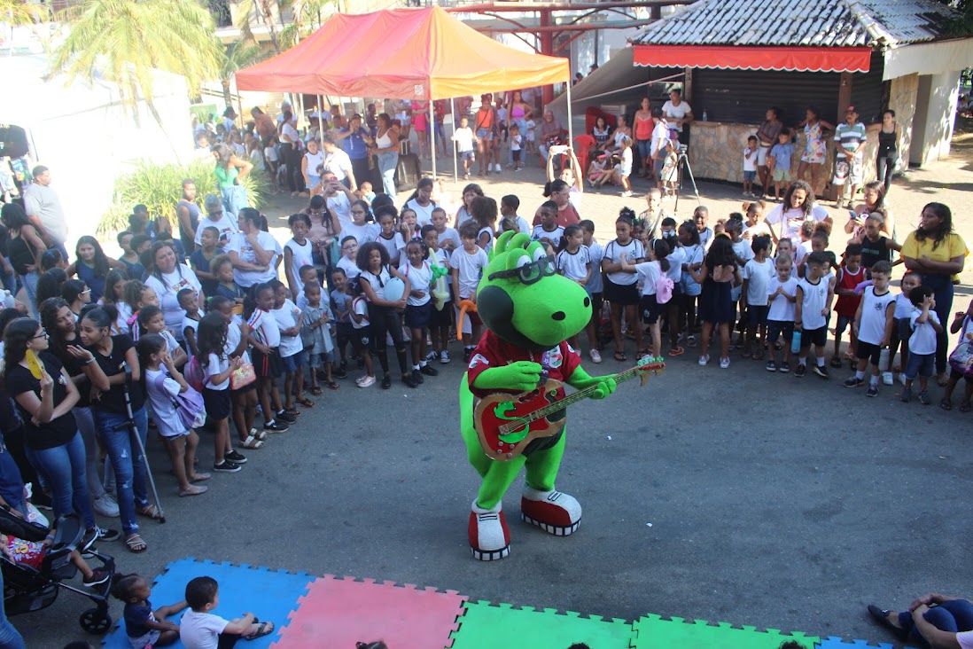 No meio da garotada, o Dinossauro ‘Saber Leitor’ e sua guitarra deram mais um show na programação da Festa Literária de Macuco
