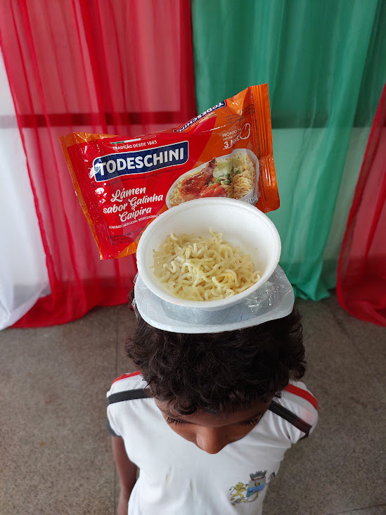 O bom humor se transformou em fome com o penteado em forma de um prato prático e delicioso de macarrão instantâneo