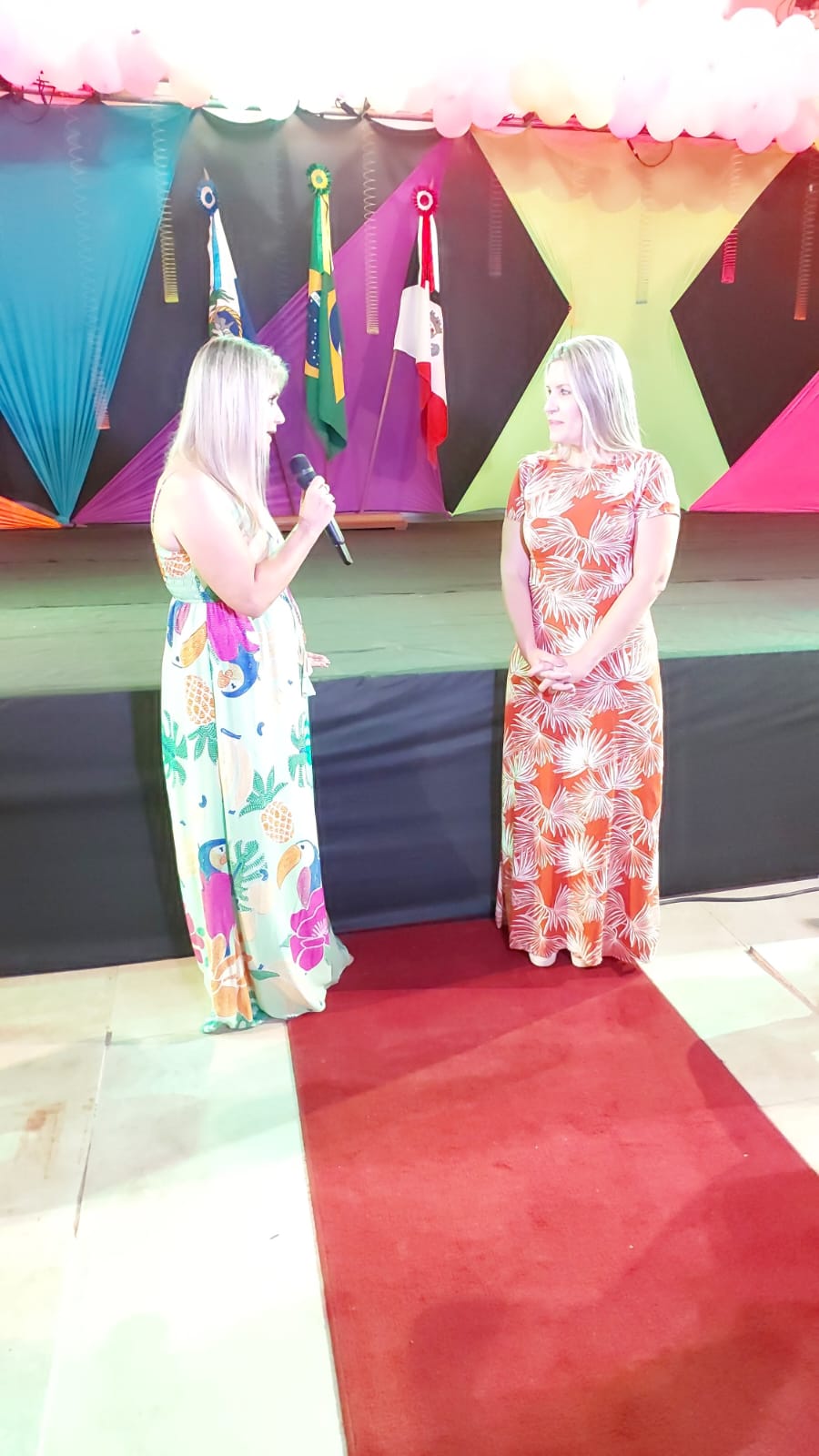 Competente e descontraído como sempre, o mestre de cerimônias Marcelo Borges brinca com a secretária de Educação e a prefeita de Macuco