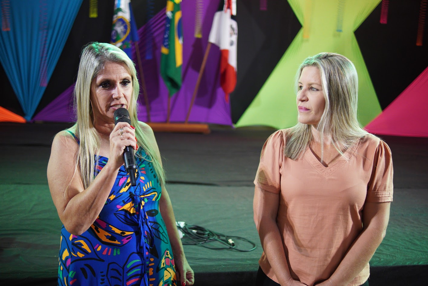 Secretária Cláudia Vogas discursa observada pela prefeita Michele Bianchini durante a solenidade no Rural Park