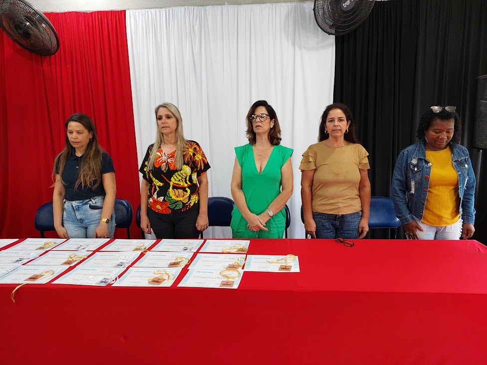 Orientadora pedagógica Anny Marini, adjunta do CIEP Patrícia Queiroz e a diretora da instituição, Marina Espíndola, na entrega de um dos certificados