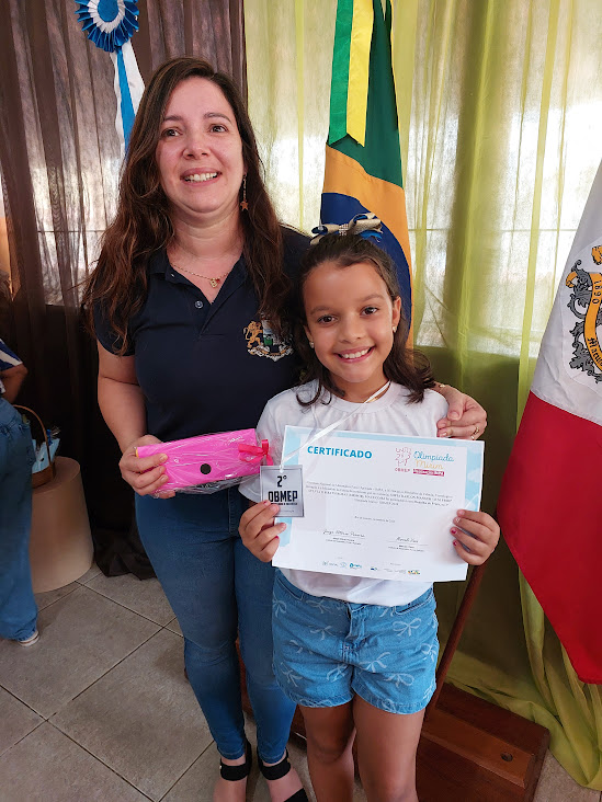 Mais uma das pequenas feras da matemática junto com a sua professora comemorando a conquista da medalha e certificado