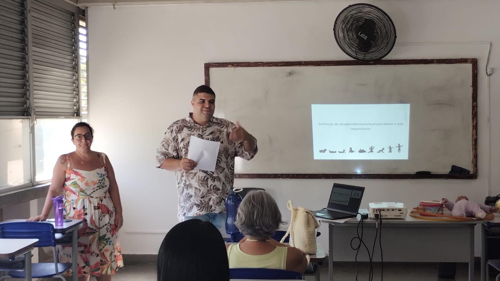 Acompanhado da diretora Sheila Penavilla, o educador físico conversa com mais uma das turmas para repassar os ensinamentos