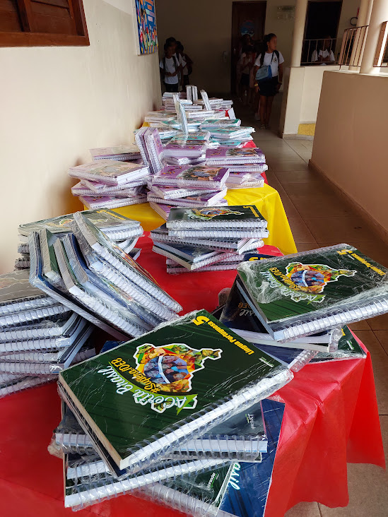 Livros didáticos expostos numa das escolas ilustram bem o apoio que a gestão vem dando para o crescimento educacional em Macuco