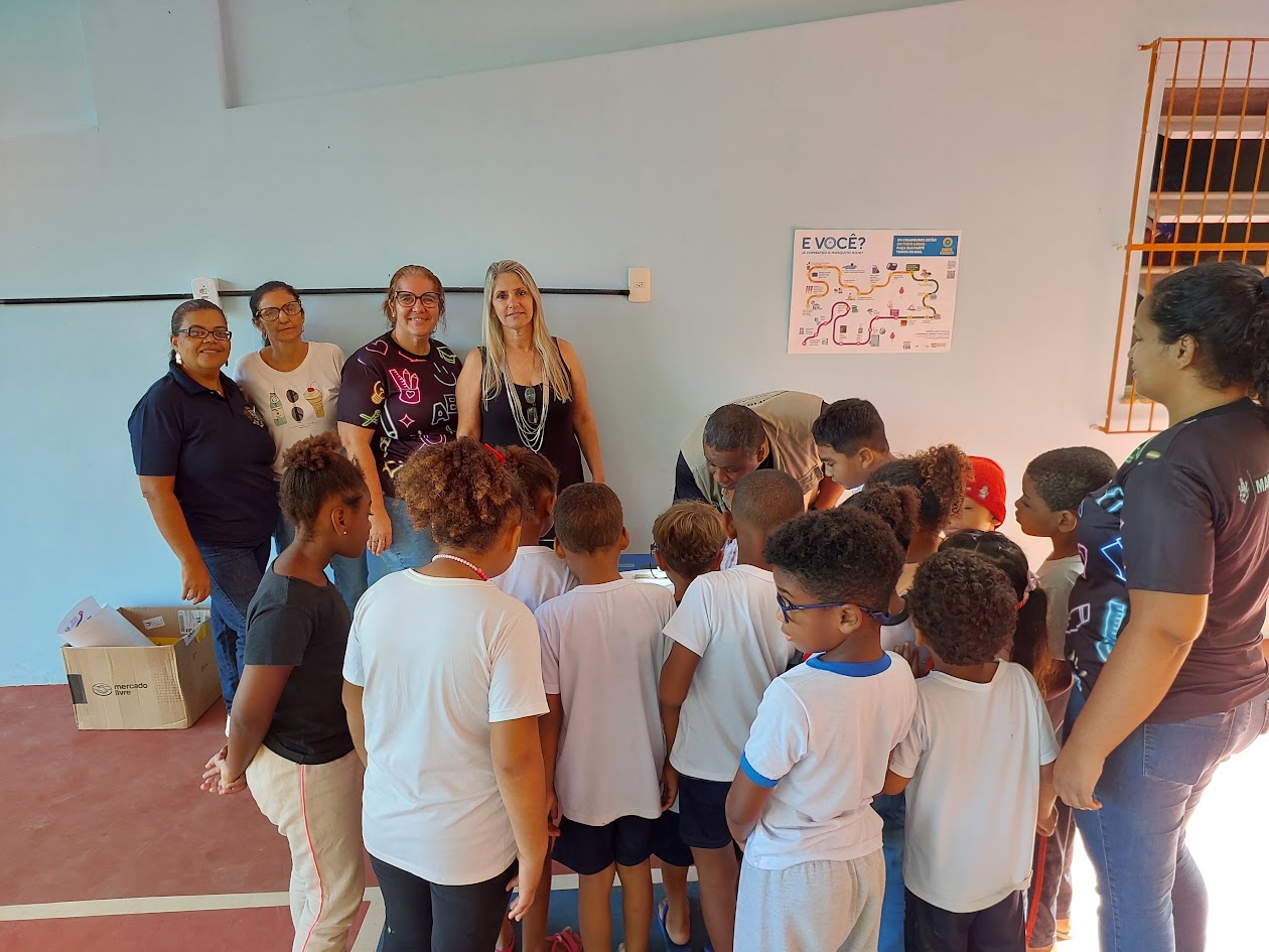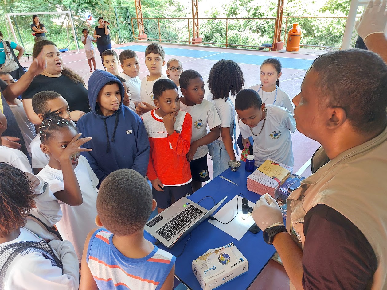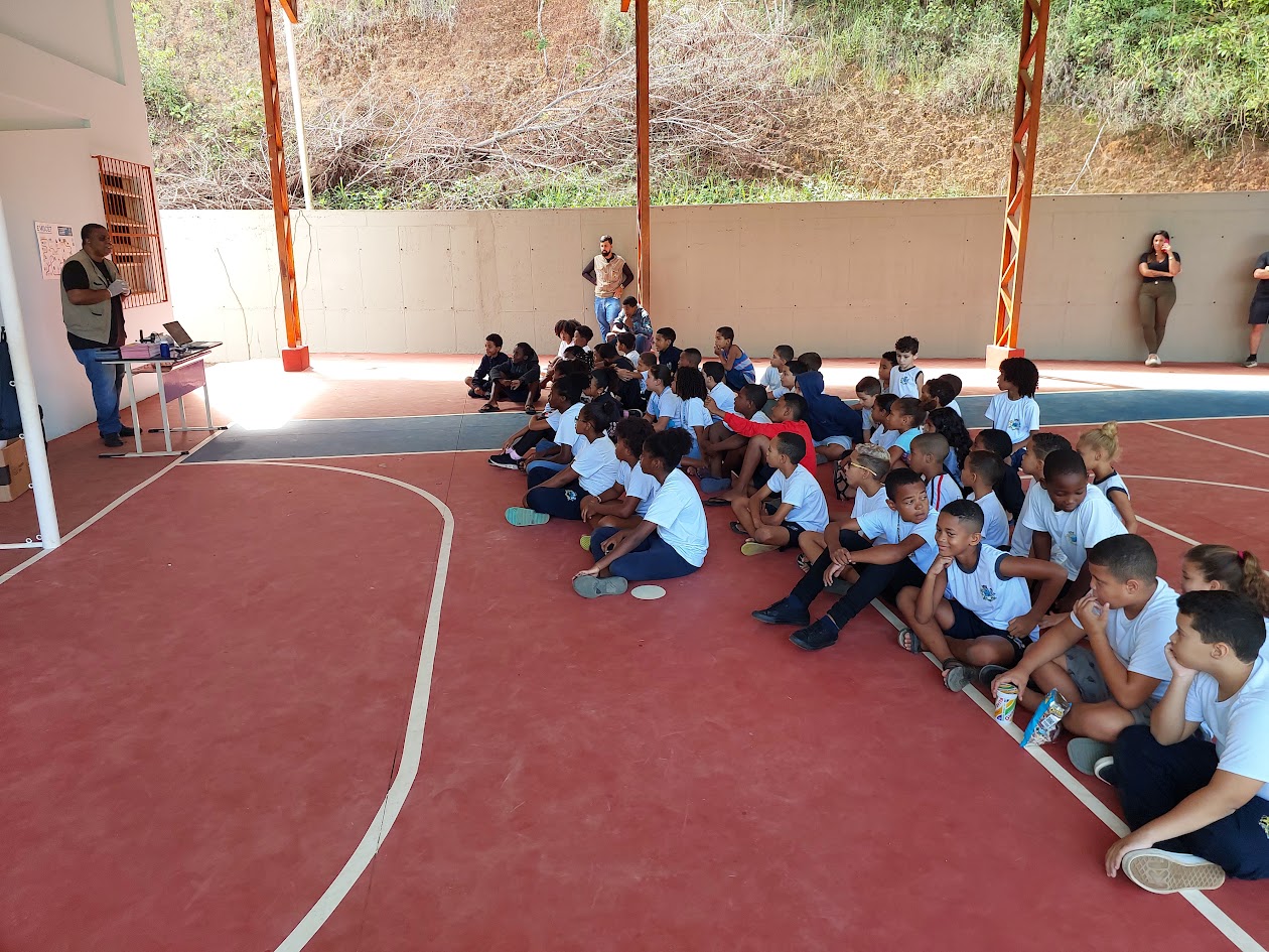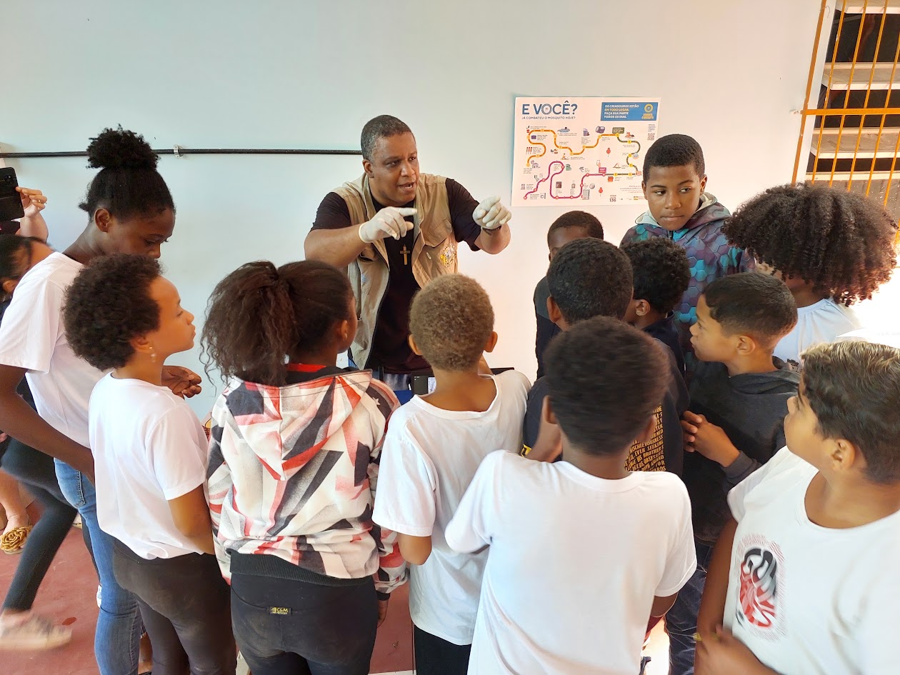 Técnico da Secretaria de Saúde reuniu a criançada na quadra da escola da Barreira para dar explicações sobre os cuidados para evitar o acúmulo de água parada