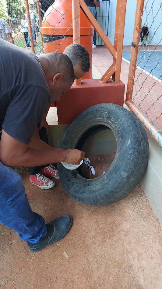 Um pneu foi utilizado para mostrar aos alunos que o mesmo não deve ter água acumulada, porque pode funcionar como criadouro dos mosquitos da Dengue