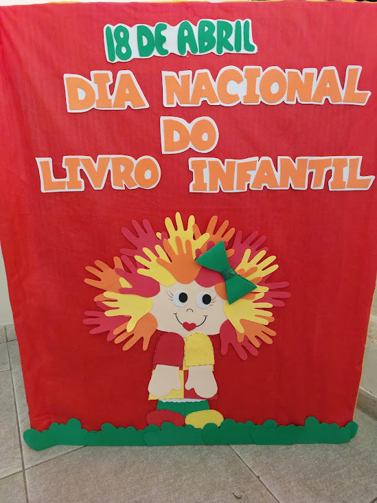 Painel lembrando que a data oficial do Dia Nacional do Livro Infantil é dia 18