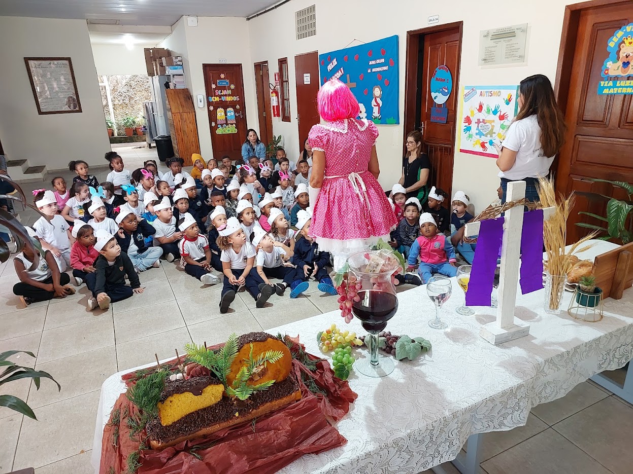 O ponto alto da celebração foi a presença cativante da Boneca Lili, personagem já querida entre os pequenos, que deu um show de simpatia ao contar, com uma linguagem acessível e lúdica, a história de Jesus Cristo e o valor simbólico dos elementos que compõem o período pascal. O encantamento se espalhou por toda a escola, que ganhou decoração especial, mesa ornamentada com carinho e a entrega de lembrancinhas confeccionadas com esmero pela equipe escolar. Tudo pensado para criar um ambiente de acolhimento e aprendizado.