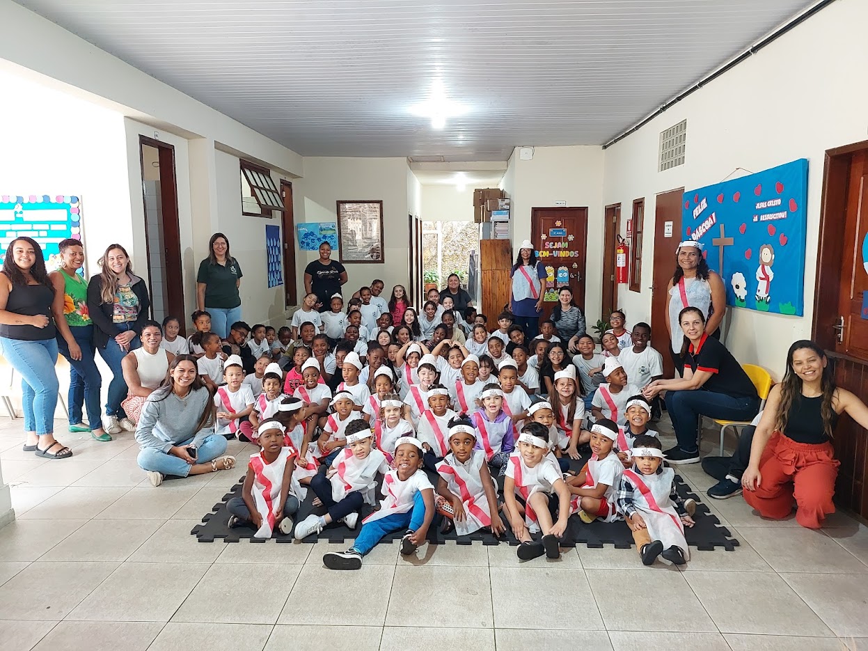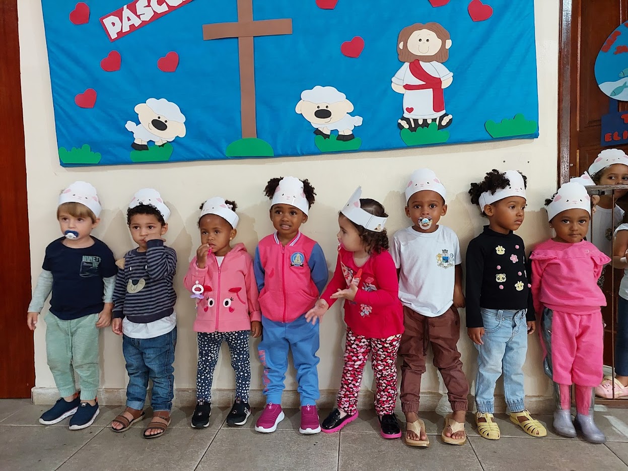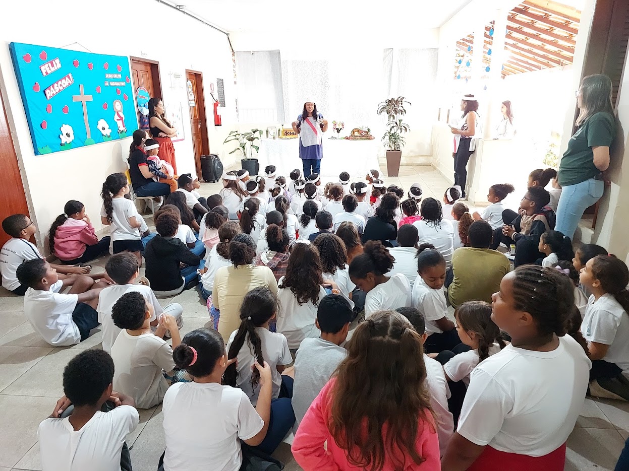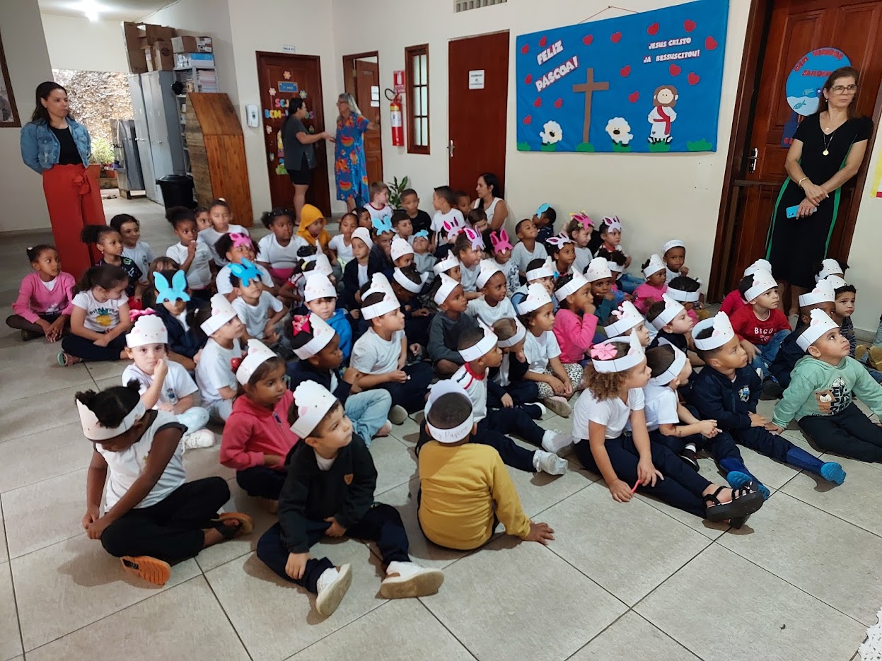 Sentadinhas no chão da escola, as crianças se mostraram integradas a tudo aquilo que lhes era apresentado sobre o tema da Páscoa