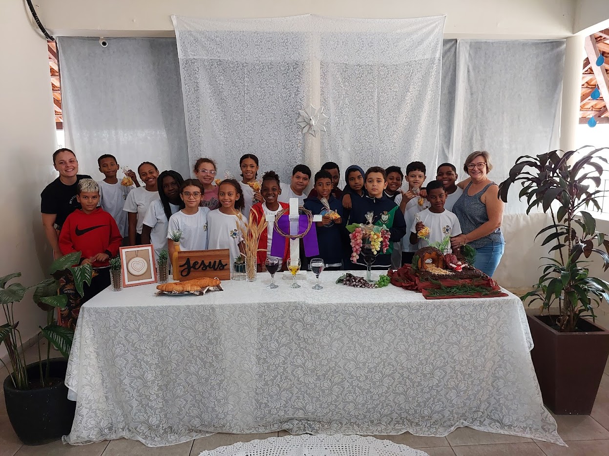 Turma e professoras da escola fizeram questão de ser fotografadas diante dessa bela mesa com os símbolos da Páscoa
