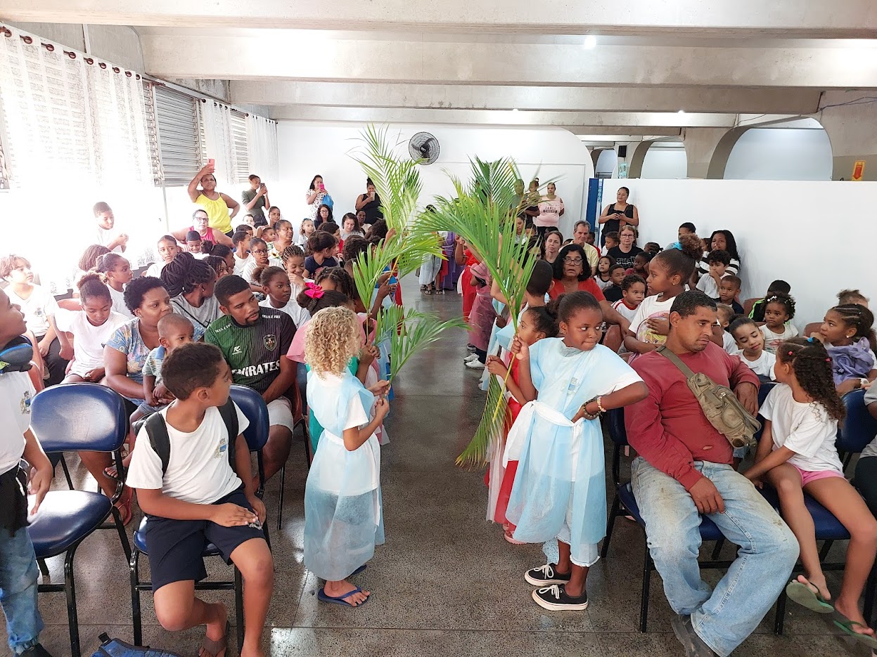 Crianças encenando o triunfal momento da entrada de Jesus Cristo na cidade de Jerusalém, no momento denominado Domingo de Ramos