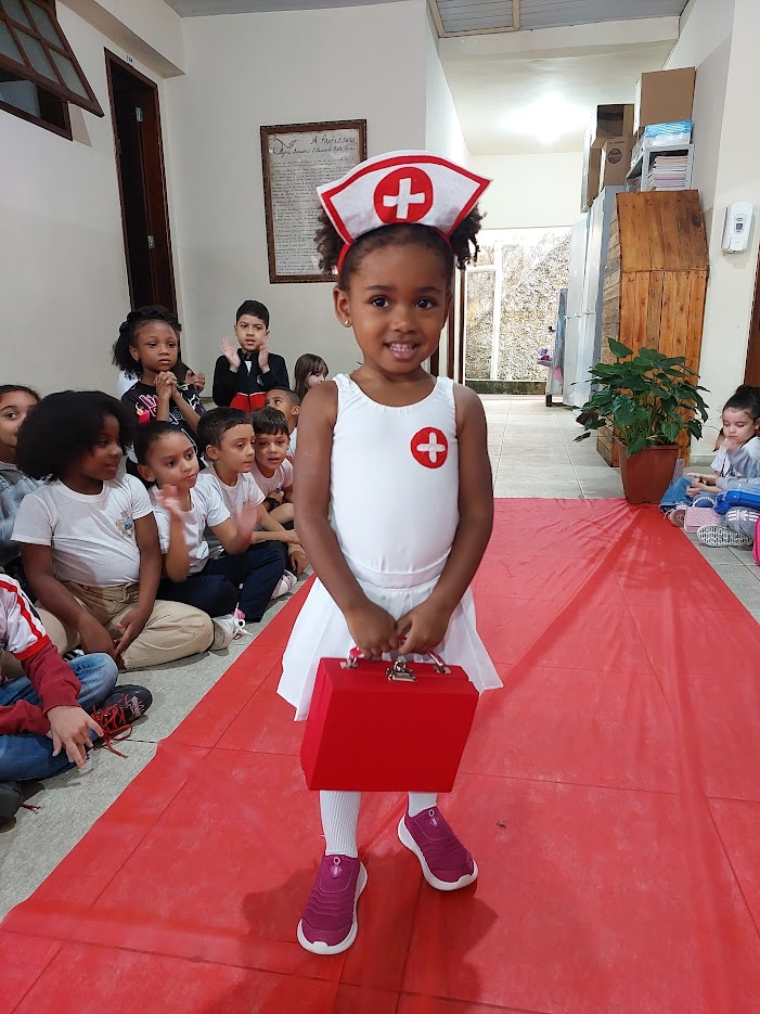 Mais uma pequena profissional de saúde entrando em cena na homenagem aos trabalhadores