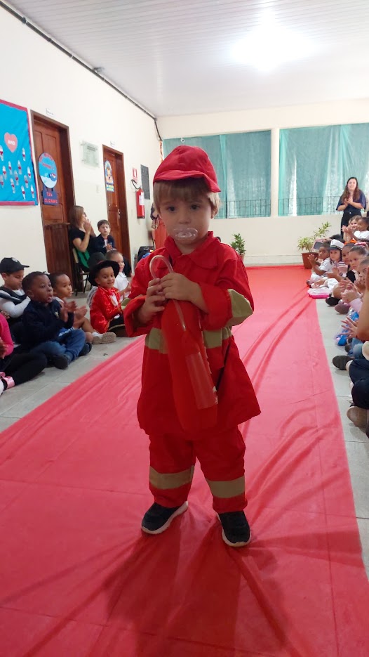 Meio tímido, mas bem vestido à caráter, o aluninho fez as vezes do profissional do fogo, o bombeiro
