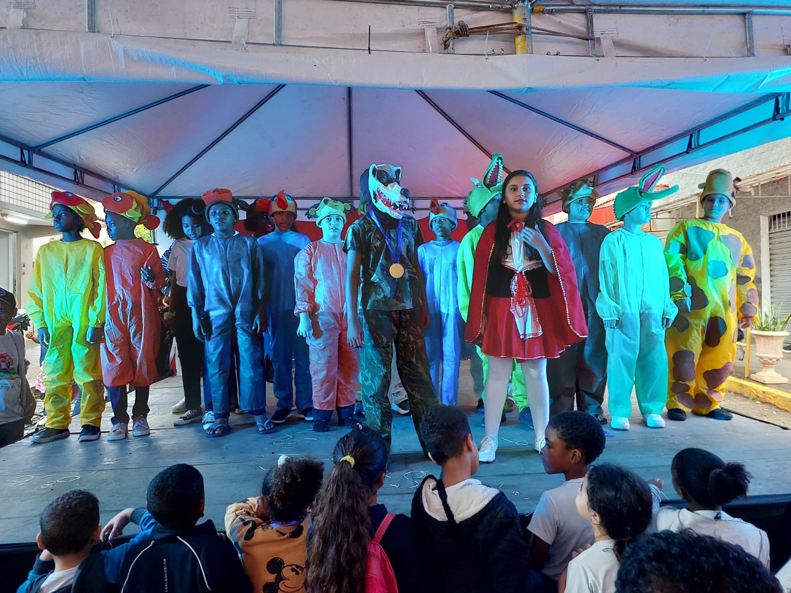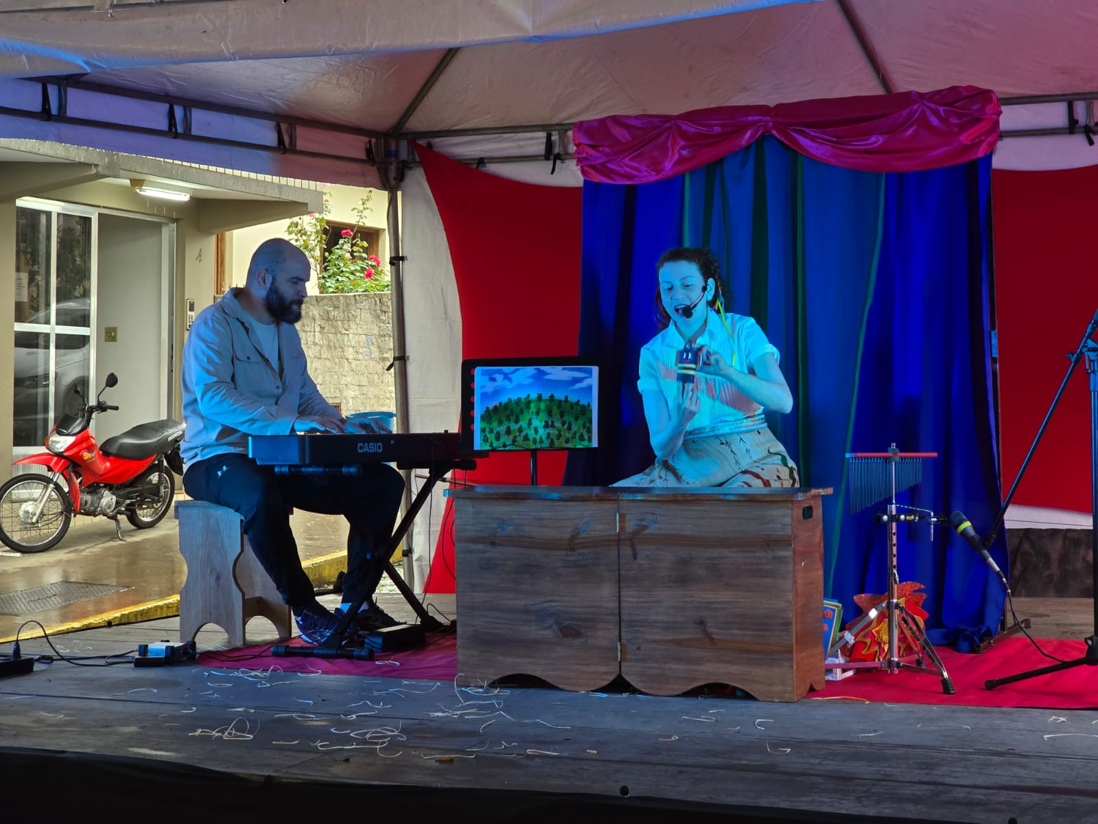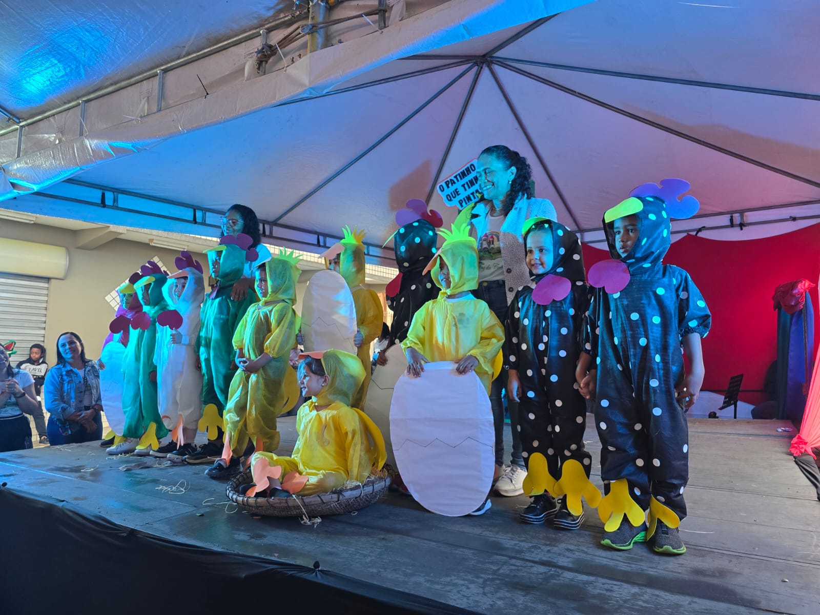 Nem o tempo fechado característico do outono brasileiro apagou o brilho do espetáculo. À tarde, mesmo sob garoa fina e frio brando, o público permaneceu firme, aquecido pelo calor das emoções no palco principal. A Banda Marcial Juliano Lopes de Souza retornou com sua energia contagiante, embalando o ambiente para as últimas apresentações. Os pequenos da Creche Zilda Ribeiro Bianchini encantaram com ‘Os Três Porquinhos’, seguidos novamente pela Cia. Artes Integradas com ‘Botelho não Queria Ler’, um verdadeiro manifesto em favor da leitura.